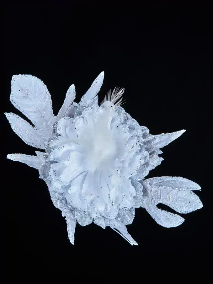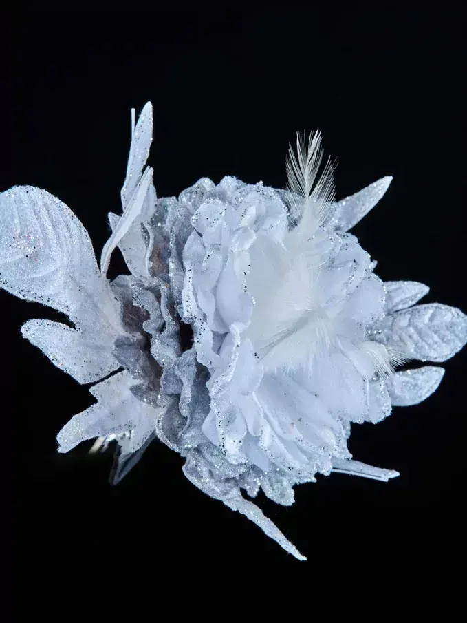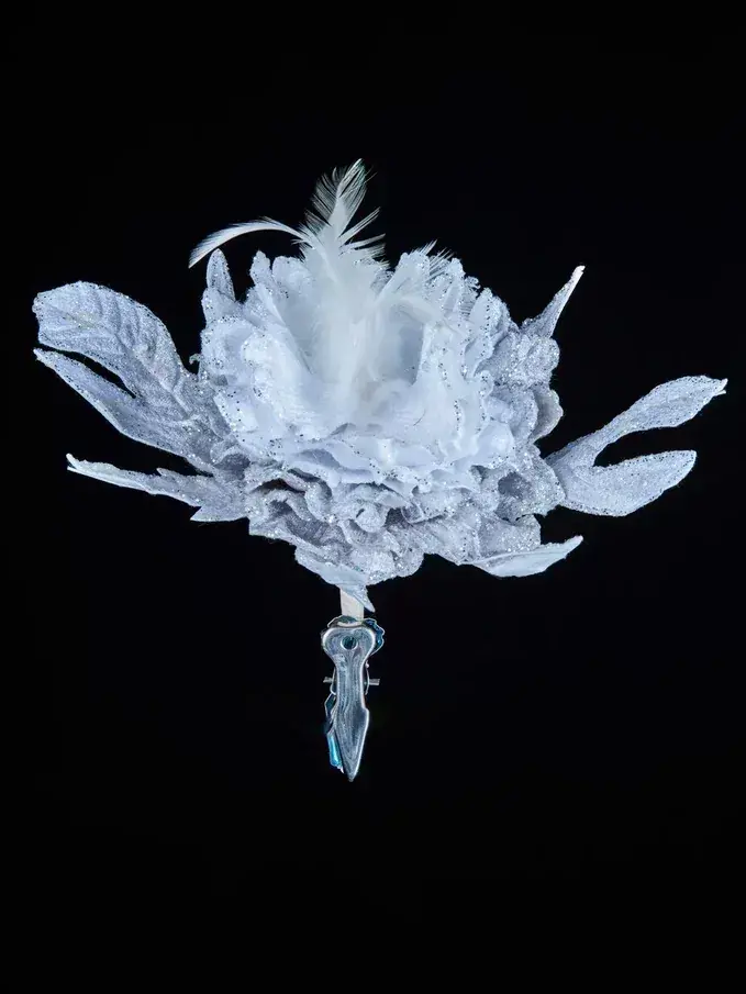 Утонченный красавец на клипсе, приближенный к монаршей особе, будет оценен по достоинству любителями нейтральных тонов. Декоративный цветок с шикарным названием «Дворцовый пион» выполнен в нейтральной серебристо-белой цветовой гамме. При этом он выглядит не скучно, а стильно и изысканно. А главное, украшение выгодно подчеркнет красоту новогодней елки.