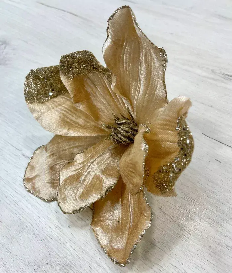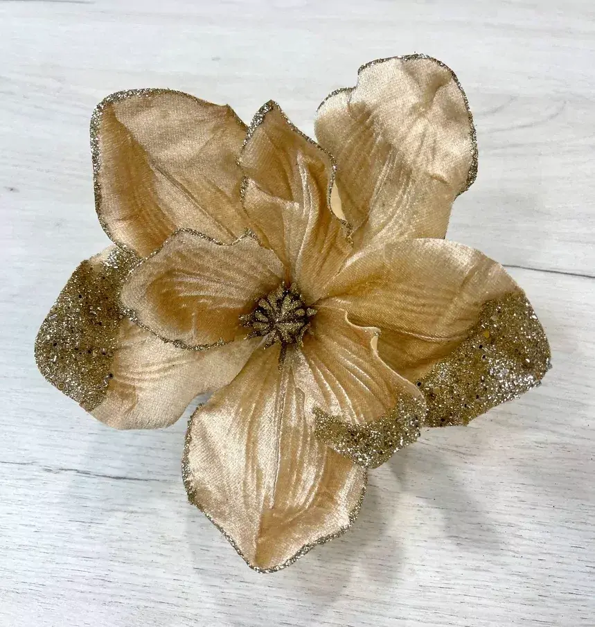 Декоративный цветок Магнолия размером 23 см, выполненный из бархата цвета шампань, станет прекрасным украшением для вашей елки. Благодаря клипсе, его легко закрепить на ветвях. Этот элемент декора идеально подойдет для создания праздничного настроения и добавит изысканности вашему новогоднему интерьеру.