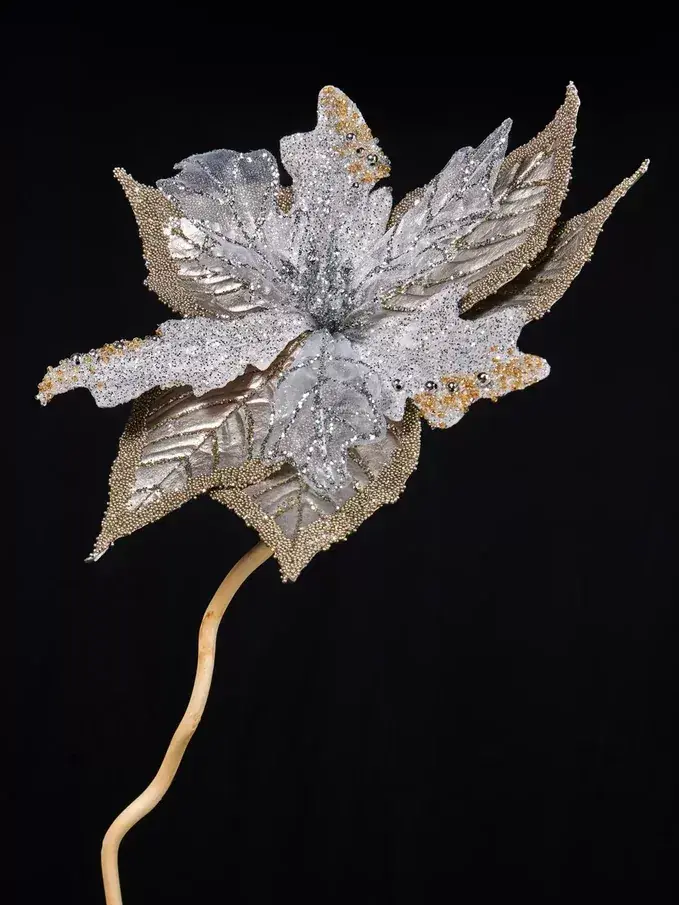 Шикарная пуансеттия имеет все шансы стать главной героиней зимних праздников, ведь во всей красе она предстает как раз к Новому году. И если вы хотите создать особенно праздничную обстановку в доме, то стоит приобрести декоративный цветок «Пуансеттия». Поистине королевские оттенки платины с серебром, изящные формы и удобное крепление на клипсе – главные достоинства этого чудесного элемента декора.