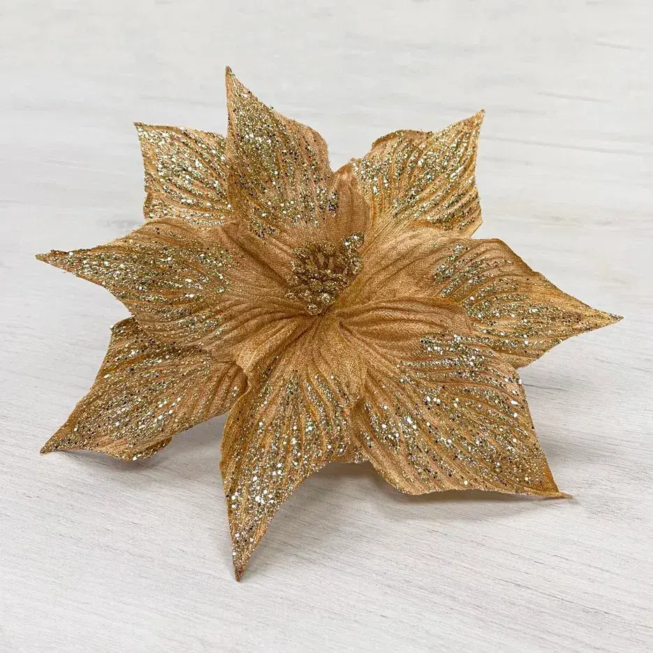 «Пуансеттия» роскошного цвета розовое золото, усыпанная мерцающими блестками – вот она, примадонна новогодней ночи! Цветок выглядит броско, но ни в коем случае не кричаще. Она элегантна, загадочна и просто чертовски хороша. Словом, как подобает настоящей примадонне!