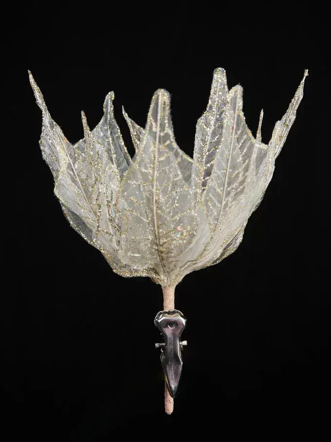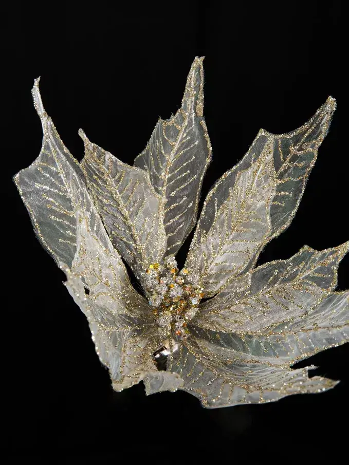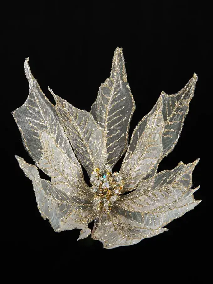 - Дизайн: Цветок выполнен в виде пуансеттии с изящными лепестками, украшенными золотыми линиями и блестками.
