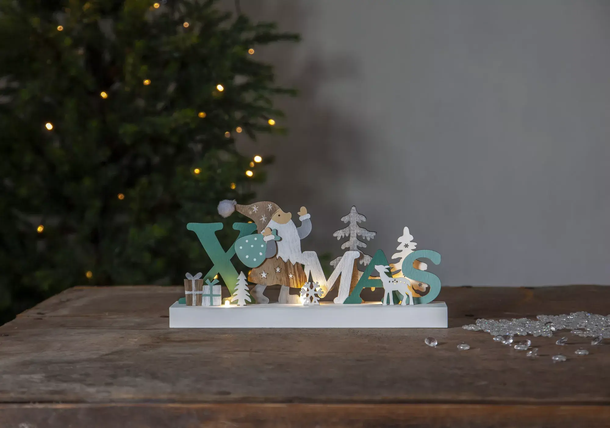 Светящаяся композиция REINBEK от Star Trading на рождественскую тематику придаст вашему праздничному столу изюминку и сделает его еще наряднее. А если у вас небольшая искусственная ель, можно поставить декорацию под нее. Высота композиции – 15 см, а ее ширина – 30 см. Изображение Деда Мороза с подарками и милого олененка на фоне елочек – любимая рождественская иллюстрация, которая обязательно понравится детям и произведет впечатление на взрослых гостей. Декорация изготовлена из дерева и выдержана в нежных ненавязчивых тонах: серебристый, белый, бирюзовый и бежевый. Режим работы: 6 ч вкл. / 18 ч выкл.