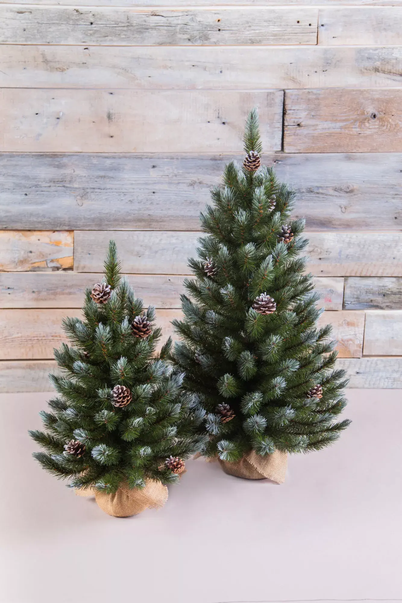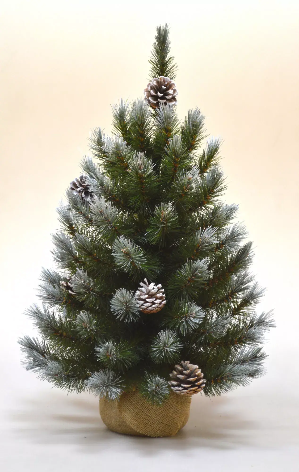 Создана она по самым передовым технологиям современного производства. Веточки сделаны из полимерной жесткой лески, они пушистые с длинными иголками, выглядят как натуральные ветви сосны. На веточках есть натуральные шишки, они придают елочке еще больше натуральности. Кончики иголок окрашены в белый цвет, это создает удивительный эффект инея на елочке в морозное утро. А подставку дизайнеры сделали из натурального дерева, обернутую в декоративную мешковину. Смотрится композиция очень оригинально.