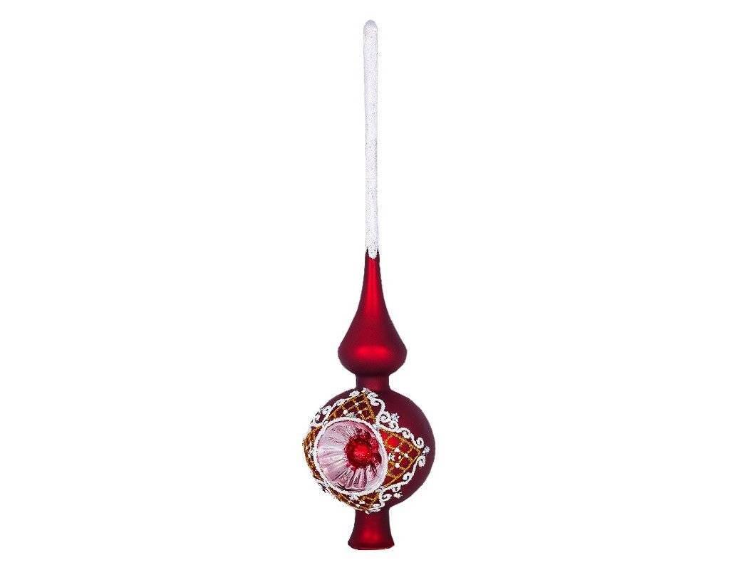 Контраст безупречной, ледяной белизны и сочного, спелого граната выглядит невероятно феерично. Белоснежное кружево на ярком фоне смотрится особенно торжественно, и в то же время очень трогательно. Стеклянная верхушка для новогодней ёлки «Ажур» станет эффектным завершающим штрихом, который преобразит ее и придаст шика. Игра контрастов – это красиво, смело и актуально!