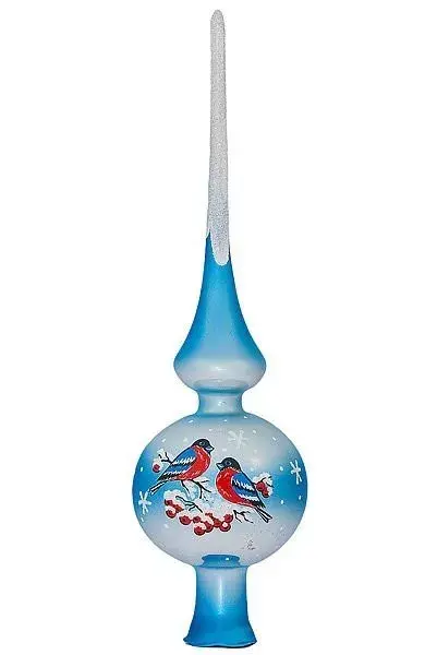 Эти милые зимние птички просто не могут не вызывать улыбки умиления! Верхушка для новогодней елки «Снегири» – отличный вариант для любителей сюжетов. Парочка снегирей, сидящих на рябинке, очень выигрышно смотрится на белом фоне. А благодаря вкраплениям небесно-голубого цвета верхушка ярче и выразительнее. Еще одна интересная фишка – эффектно оформленный наконечник.