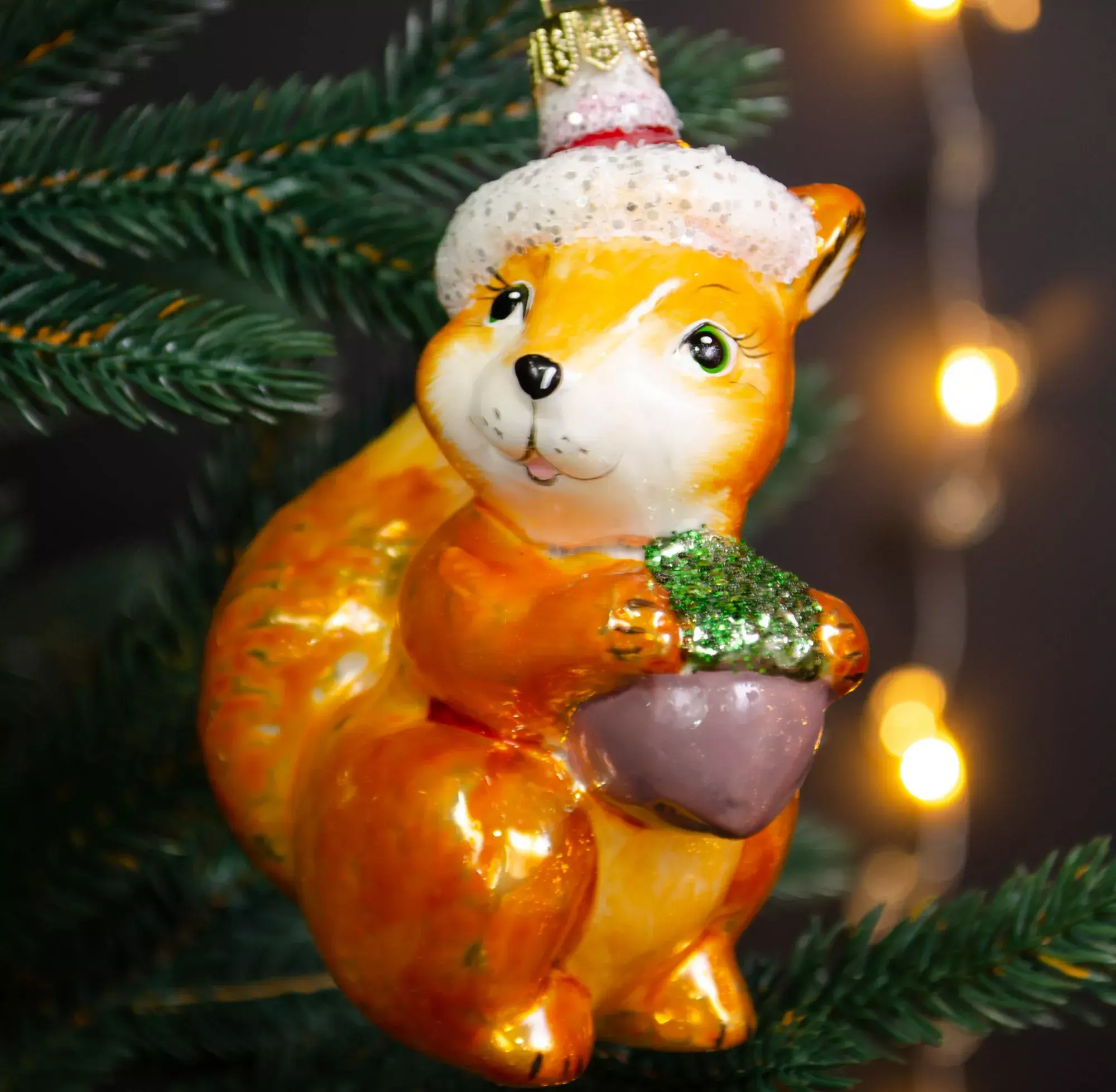 Елочные украшения в виде лесных зверушек – идея, проверенная временем. Бельчонок, держащий желудь, вызывает умиление. Его рыженькая спинка и белая мордочка смотрятся так трогательно, что не обратить внимания на милого малыша просто невозможно. Новогоднее украшение «Бельчонок с желудем» от популярного бренда Irena эффектно украсит любую елку и подарит праздничное настроение.