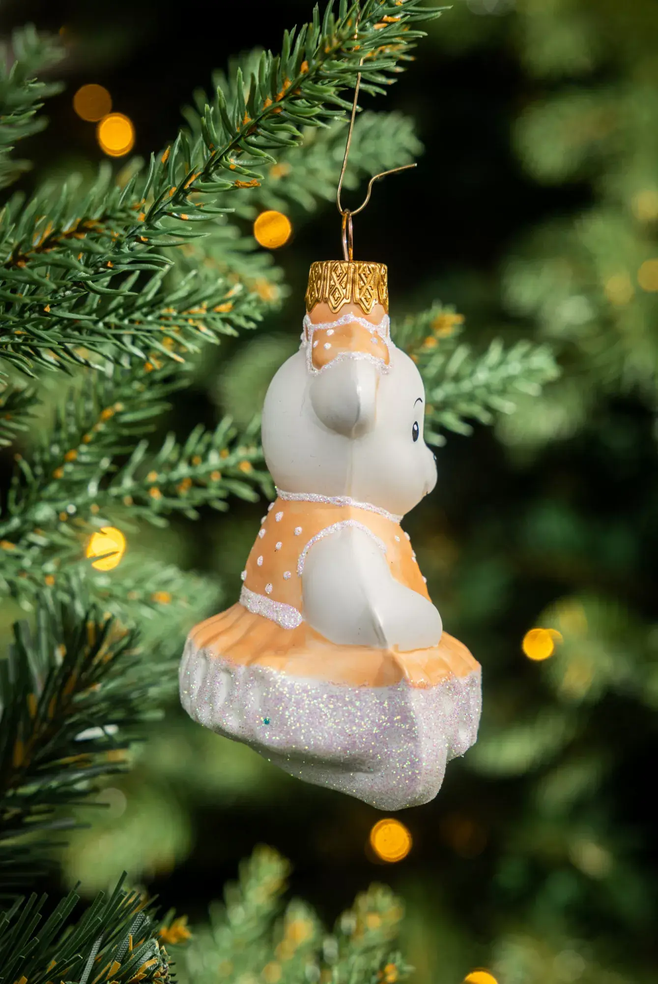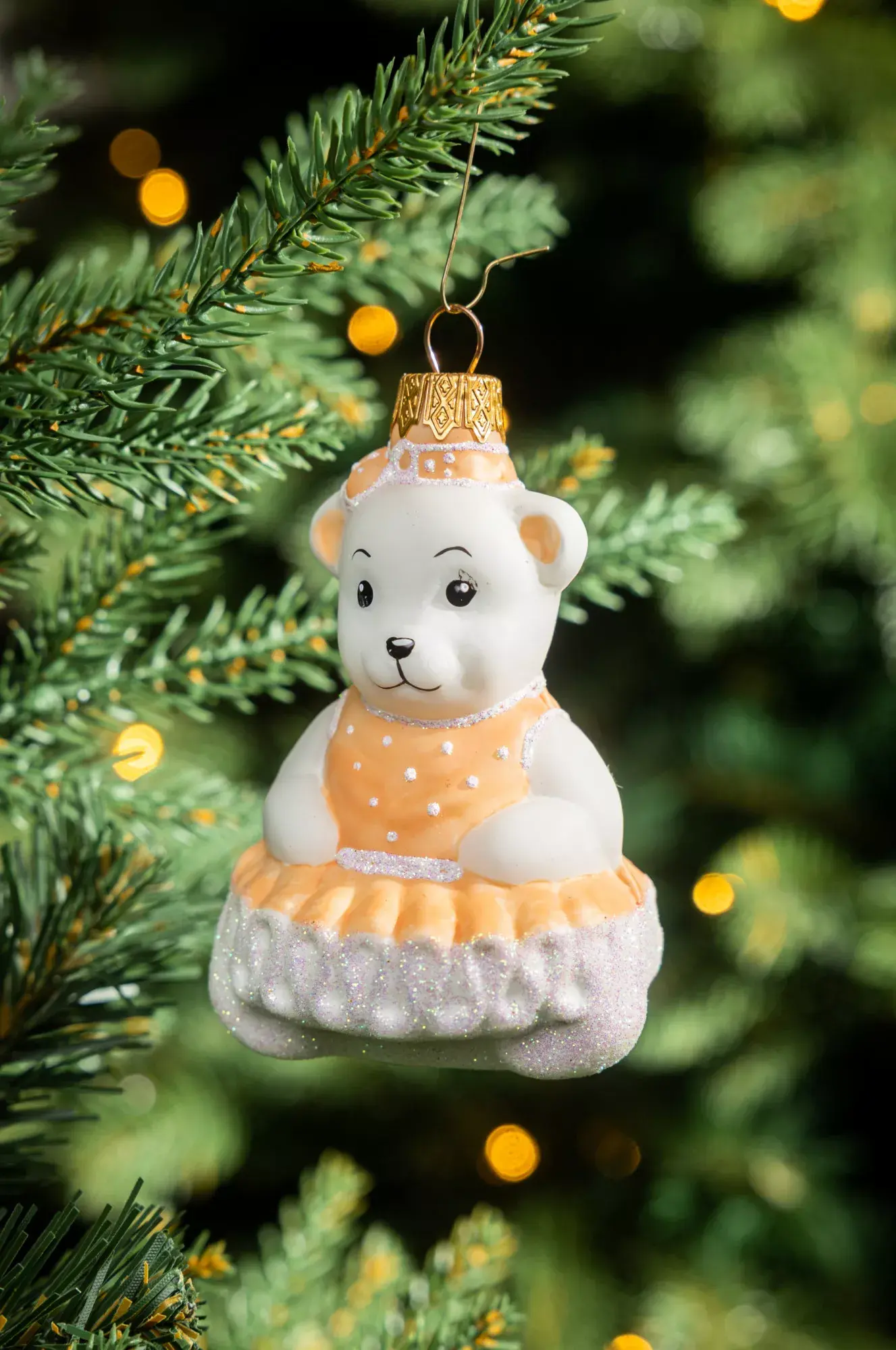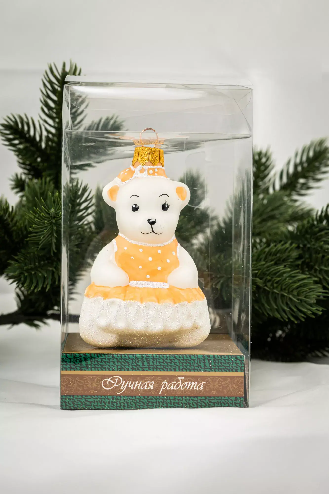 Формовая белоснежная игрушка медвежонок-девочка в нежно-персиковом платье с пышными оборками - это само воплощение женственности и стиля. Нежные оттенки данного украшения дополнят наряд даже самой изысканной ели. Получив данную игрушку в подарок каждый любитель стекла получит массу положительных эмоций.