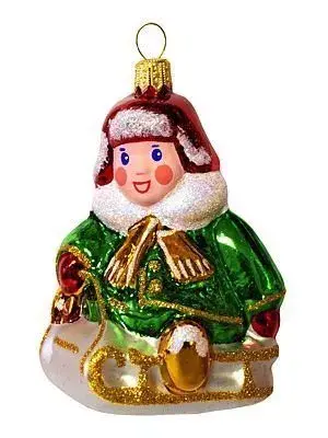 Стеклянное елочное украшение «Мальчик на санках», выполненная в жизнерадостных цветах, с первого взгляда вызывает улыбку. Такая забавная и колоритная игрушка уж точно не затеряется среди других елочных украшений. Веселый, румяный крепыш в яркой одежде навевает мысли о наших любимых зимних забавах и моментально создает новогоднее настроение.