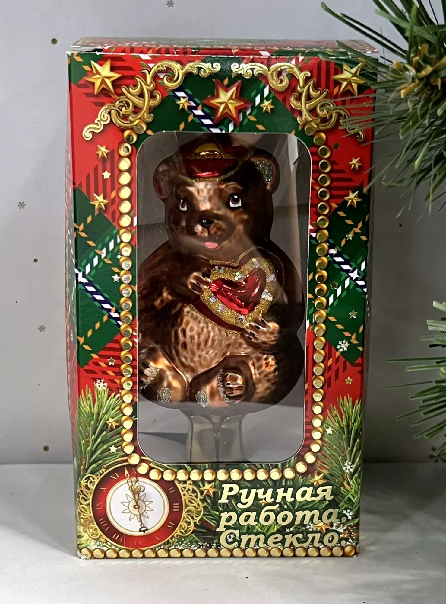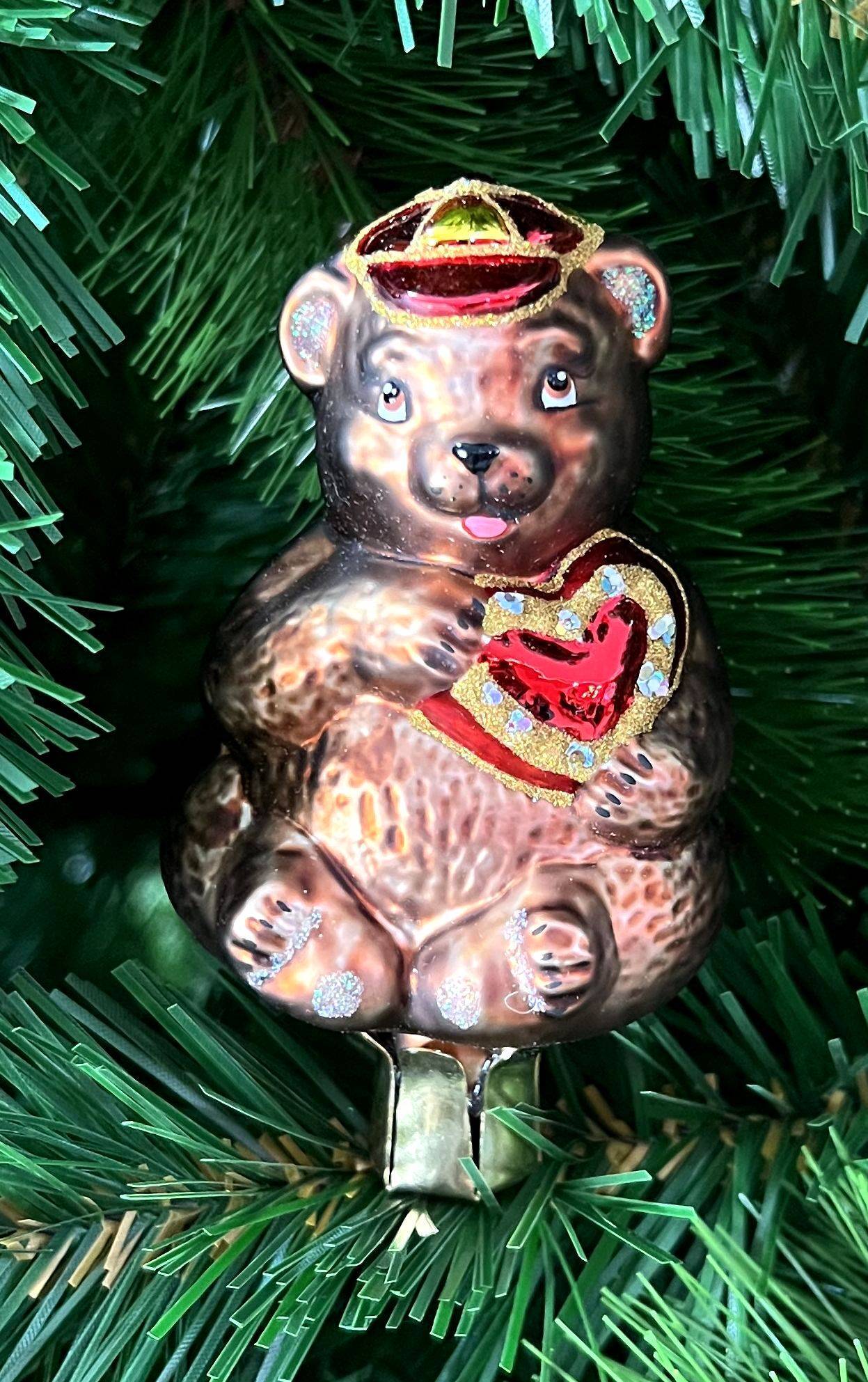 Симпатичный «Медведь на прищепке» бронзового цвета выглядит шикарно и празднично. А детали красного цвета ненавязчиво подчеркивают красоту и благородный вид игрушки. Изделие эффектно и креативно смотрится на елке золотистого или красного цвета и рекомендуется тем, кто не боится экспериментов.