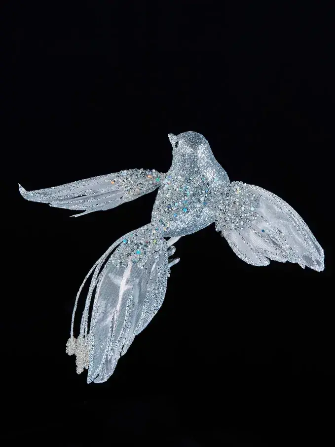 Елочное украшение Птица счастья от Christmas DeLuxe — это изысканное украшение, выполненное в серебряных тонах с использованием бисера. Его размеры составляют 18×25 см, что делает его заметным элементом декора. Украшение оснащено клипсой, что позволяет легко закрепить его на елке. Эта декоративная птица выполнена в серебристых тонах и украшена блестящими элементами, такими как бисер и пайетки. Она имеет изящные крылья с прозрачными вставками, которые создают эффект легкости и воздушности. Хвост птицы украшен по-особенному, что добавляет ей утонченности. Птица выглядит как символ счастья и праздника, идеально подходящий для украшения новогодней елки или интерьера. Ее серебряный цвет и блеск делают ее особенно привлекательной и роскошной.