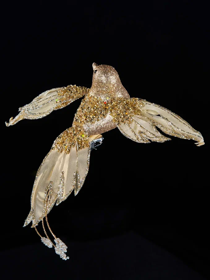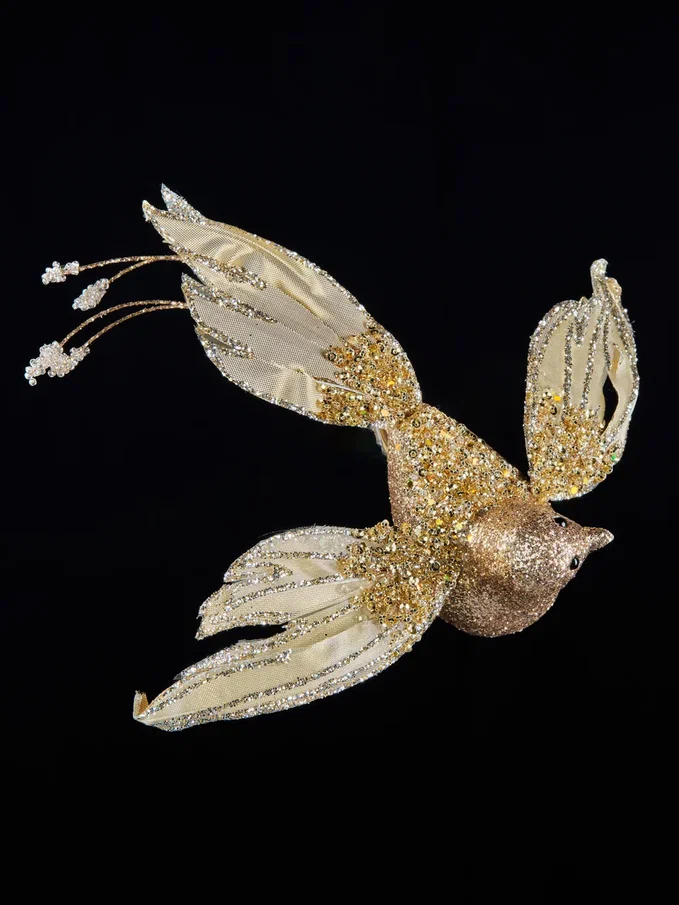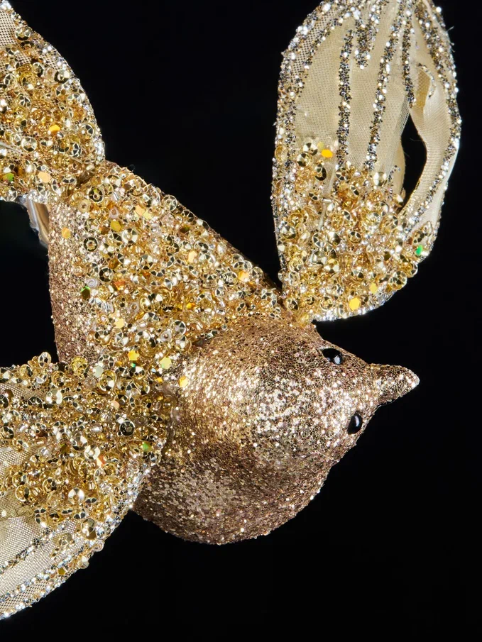Елочное украшение Птица счастья от Christmas DeLuxe — это изысканное украшение, выполненное в золотистых тонах с использованием бисера. Его размеры составляют 18×25 см, что делает его заметным элементом декора. Украшение оснащено клипсой, что позволяет легко закрепить его на елке. Эта декоративная птица выполнена в золотистых тонах и украшена блестящими элементами, такими как бисер и пайетки. Она имеет изящные крылья с прозрачными вставками, которые создают эффект легкости и воздушности. Хвост птицы украшен мелкими по-особенному, что добавляет ей утонченности. Птица выглядит как символ счастья и праздника, идеально подходящий для украшения новогодней елки или интерьера. Ее золотистый цвет и блеск делают ее особенно привлекательной и роскошной.