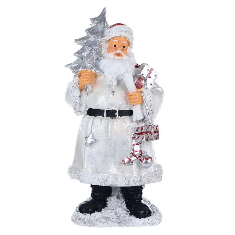 Дед Мороз нового поколения, облаченный в модное белое пальто с черным пояском, смотрится импозантно и невероятно стильно. В его руках современная серебристая елочка и симпатичный мешок с подарками. Высота изделия – 33 см, и если у вас не слишком высокая елка, «Дед Мороз новый» – то, что вам нужно! Эта оригинальная фигурка подойдет к ели любого оттенка.