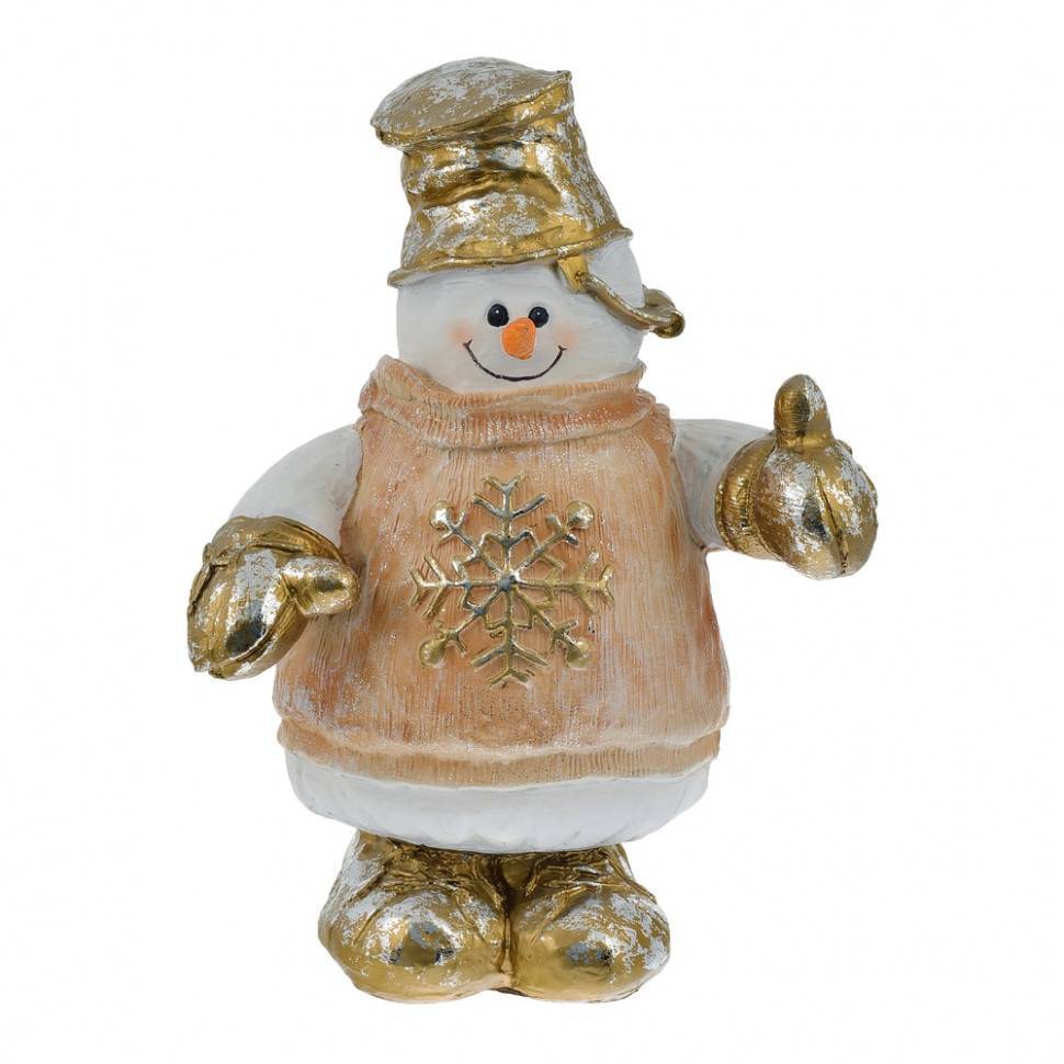 «Снеговик со снежинкой» настоящий модник, ведь на его стильном жилете красуется снежинка, а головной убор в виде традиционного ведра не простой, а золотой. Высота фигурки, изготовленной из полистоуна – 36 см, и под елочкой средней величины он будет смотреться очень выигрышно. А если ваше деревце белого, розового или красного цвета, сочетание будет удивительно эффектным.