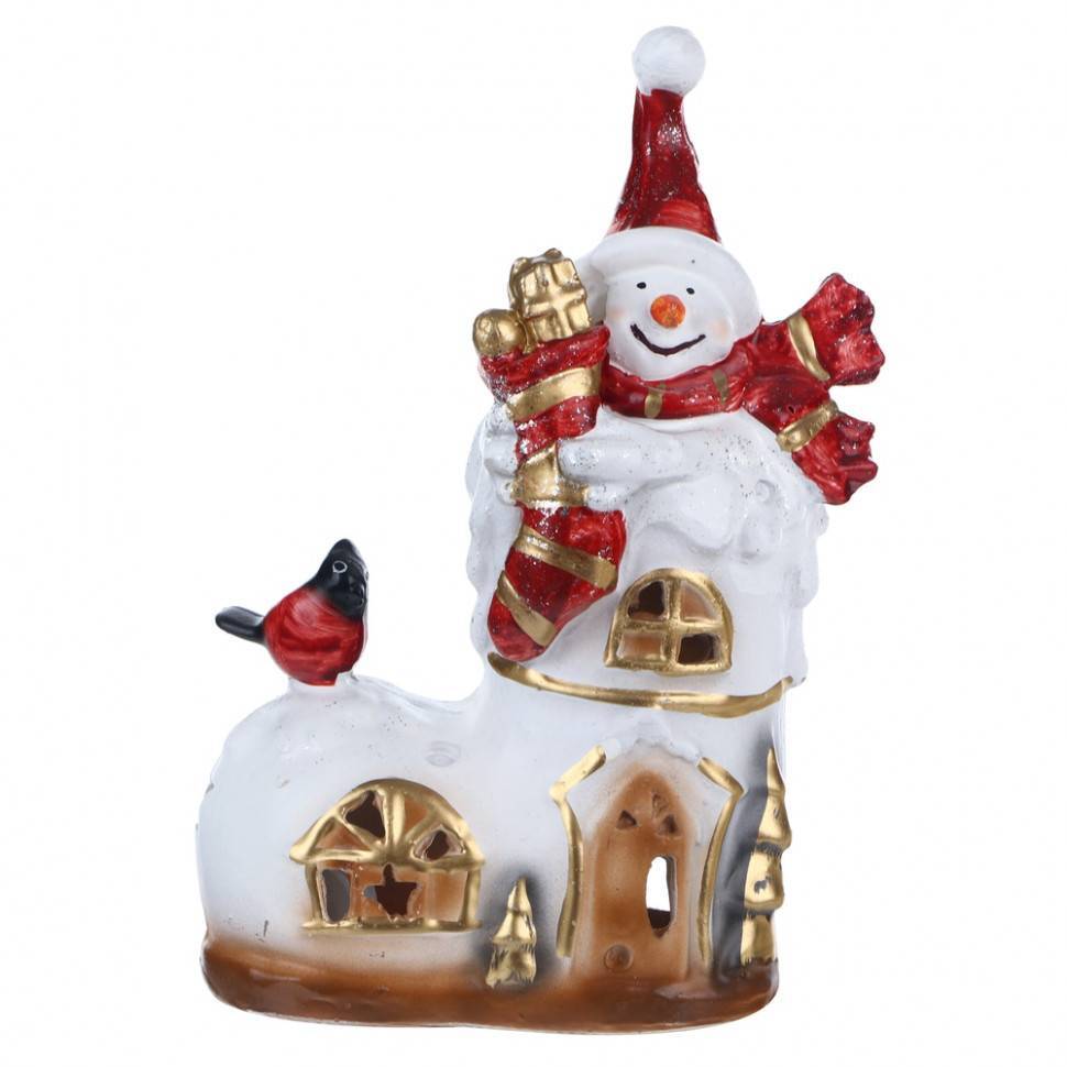 Оригинальная декоративная фигурка «Снеговик-теремок» – беспроигрышный вариант для заснеженной ели. Высота фигурки – 24 см, и это оптимальный вариант для небольшого новогоднего деревца. Белоснежная фигурка – отличное украшение под елочку красного и золотого цвета. Именно в этих двух цветах выполнены детали, поэтому сочетание получится очень гармоничным.