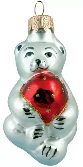 Играют ли белые мишки в мячик? Безусловно, если речь идет о елочной игрушке «Медвежонок с мячом»! Преподнесите это оригинальное украшение тому, кто любит активные игры, и презент будет оценен по достоинству. Серебристо-белый медведь и ярко-красный мяч с декором черного и золотого цвета – сочетание смелое и очень привлекательное. Такой мишка будет прекрасно смотреться на дереве темного цвета.