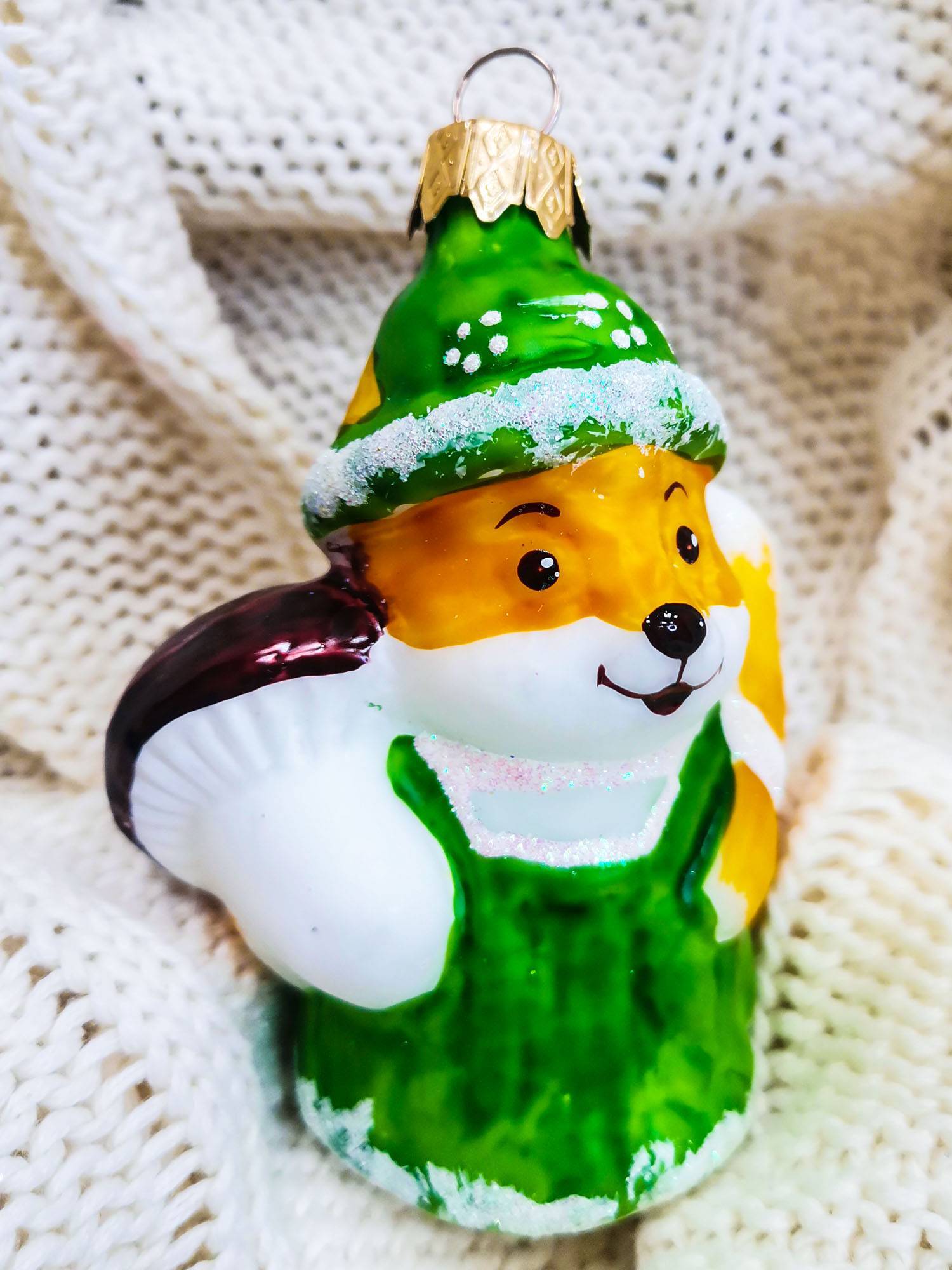 Еще один популярный персонаж новогодних открыток – белочка. А в нашем каталоге лесная зверушка представлена в виде елочной игрушки. Наша белочка – настоящая модница! На ней шляпка цвета молодой зелени и сарафанчик в тон. Игрушка «Белочка в шляпке» органично впишется в любой дизайн елки и гарантирует приподнятое настроение взрослым и детям.