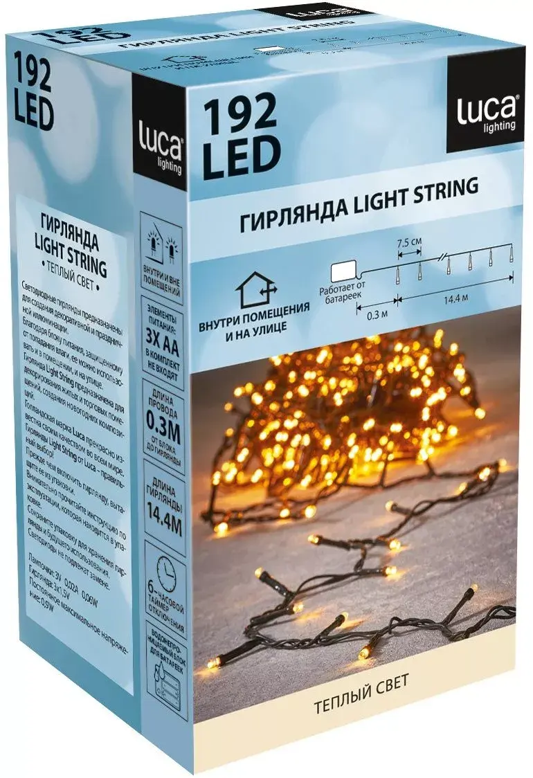 Гирлянда на батарейках 14.4 м., 192 LED ламп теплого свечения, статика, таймер, LUCA Lighting (83786) – купить за 1 100 ₽ | Мир Ёлок — ваш лучший выбор для создания волшебной атмосферы на Новый год!