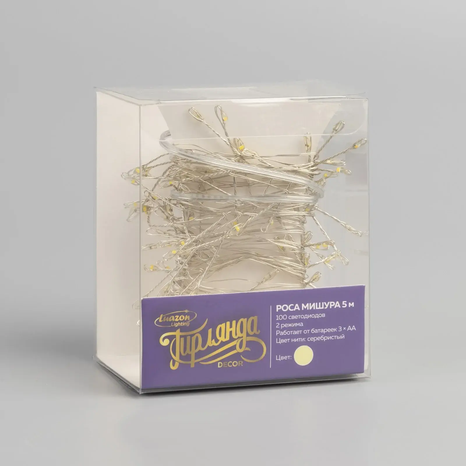 Гирлянда нить-роса длиной 5 м на удивление гармонично впишется в новогодний праздник. Нереально прекрасное, фееричное сияние 100 теплых белых LED-ламп напоминает снег, искрящийся на солнце. Гирлянда укреплена на еле заметную нить серебристого цвета. Изделие предназначено только для украшения помещений, функционирует в двух режимах, от батареек AA х 3.