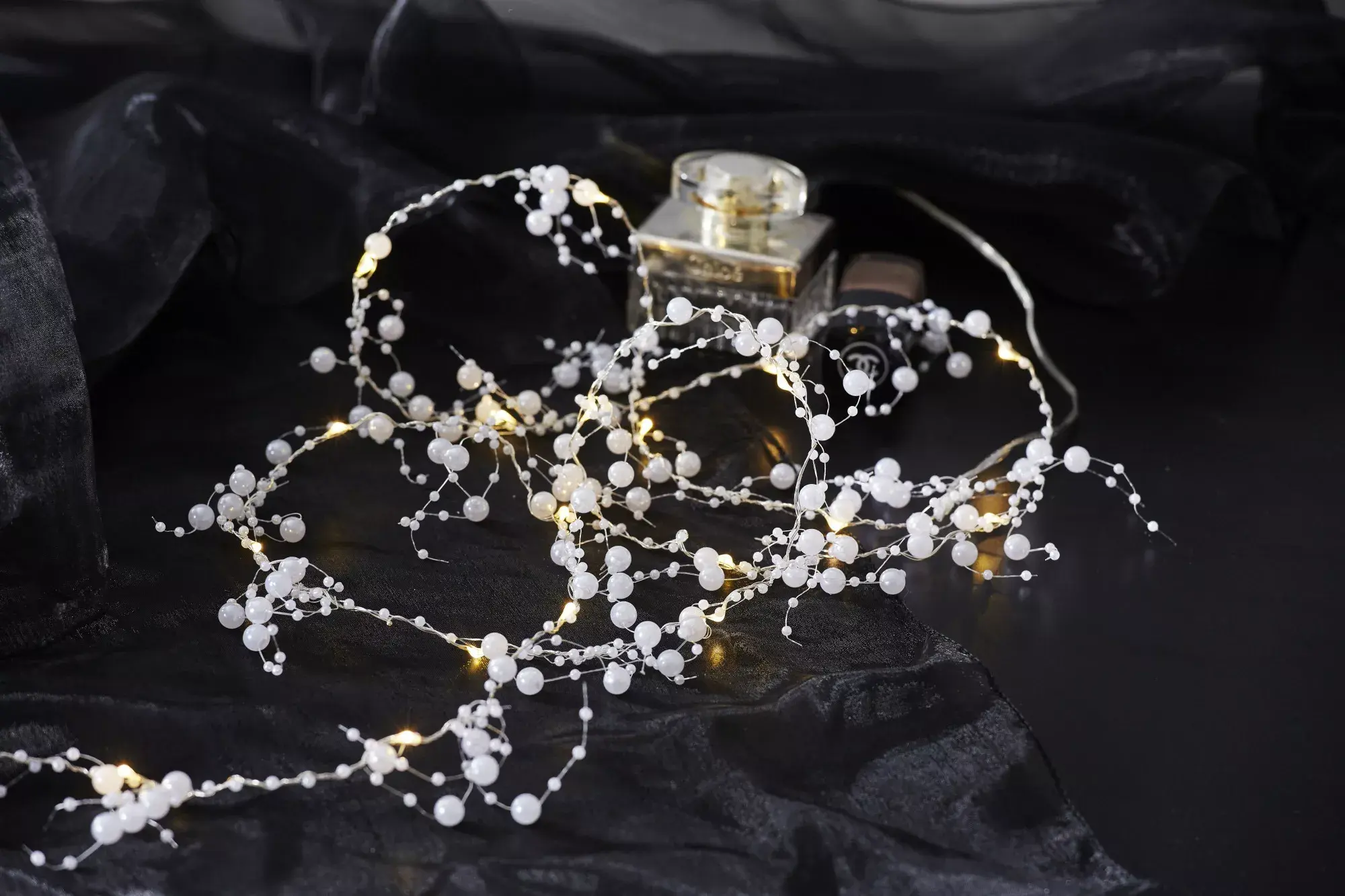 Гирлянда с таймером из серии Dew Drops, декорированная искуственными жемчужинами. Dew Drops - это гирлянды нового поколения, элементами свечения в которых являются светодиодные мини кристаллы, выполненные в виде «слезинок». Предназначена для использования внутри помещений.
