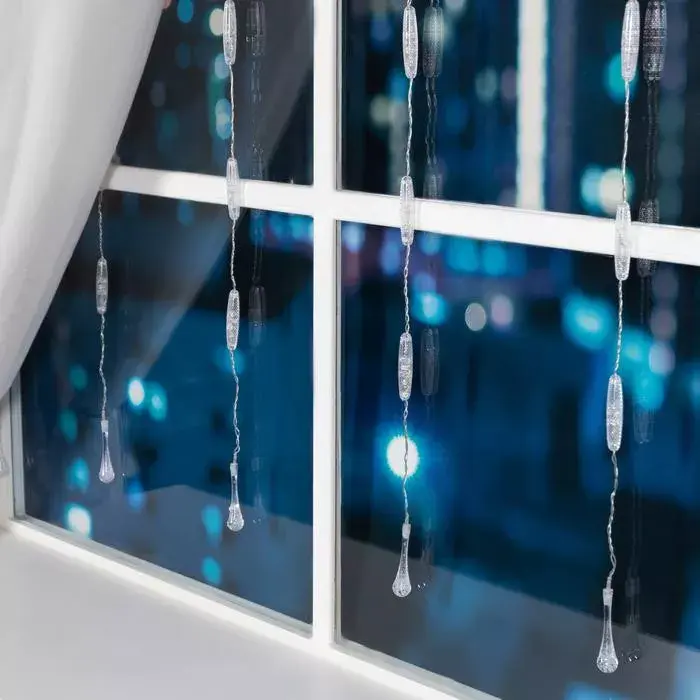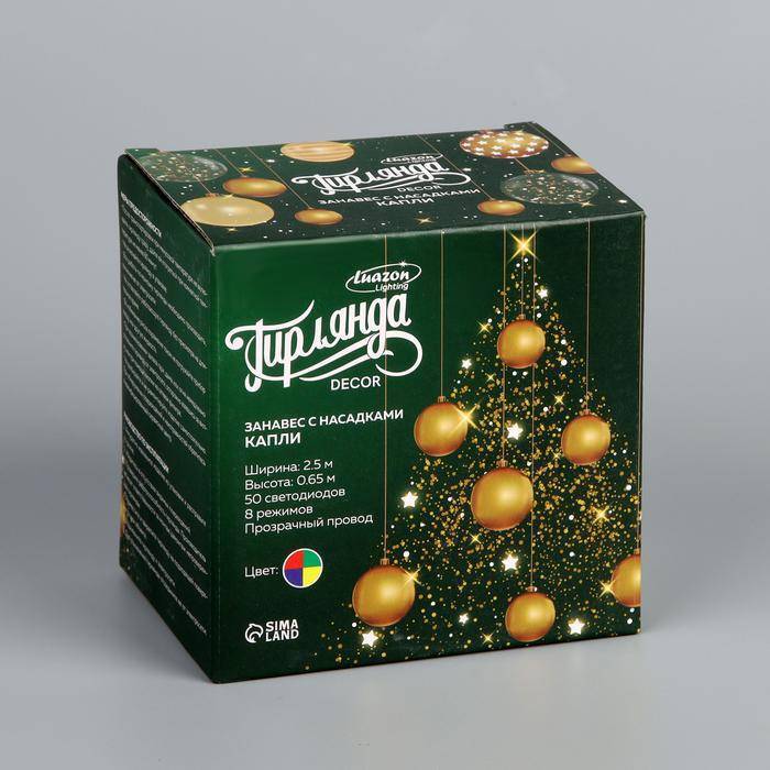 Поприветствуйте хит последних нескольких лет – гирлянду-занавес «Капли»! Загадочное мерцание 50 LED-ламп, напоминающее сияние драгоценных камней, настроит вас на волну позитива. А благодаря прозрачной, практически невидимой нити вы будете видеть только их красоту и ничего лишнего. Гирлянда представлена в трех цветовых решениях – белый, теплый белый, мульти. Работает в 8 режимах. Параметры изделия – 2,5 на 0,65 м.