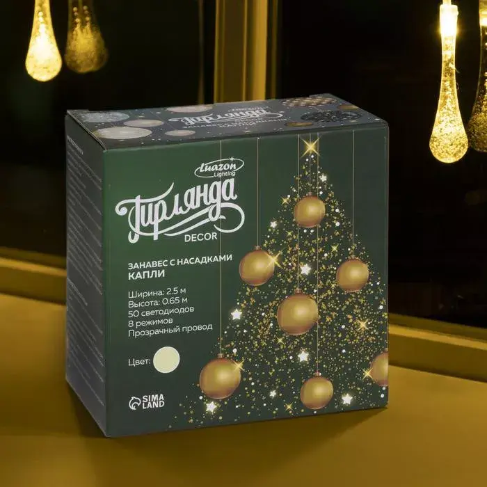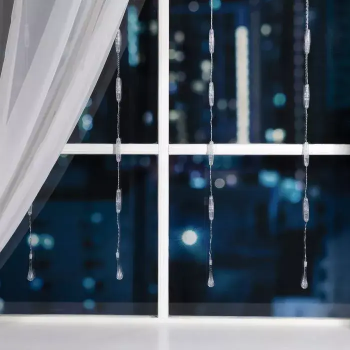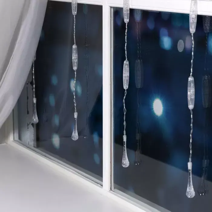 Поприветствуйте хит последних нескольких лет – гирлянду-занавес «Капли»! Загадочное мерцание 50 LED-ламп, напоминающее сияние драгоценных камней, настроит вас на волну позитива. А благодаря прозрачной, практически невидимой нити вы будете видеть только их красоту и ничего лишнего. Гирлянда представлена в трех цветовых решениях – белый, теплый белый, мульти. Работает в 8 режимах. Параметры изделия – 2,5 на 0,65 м.