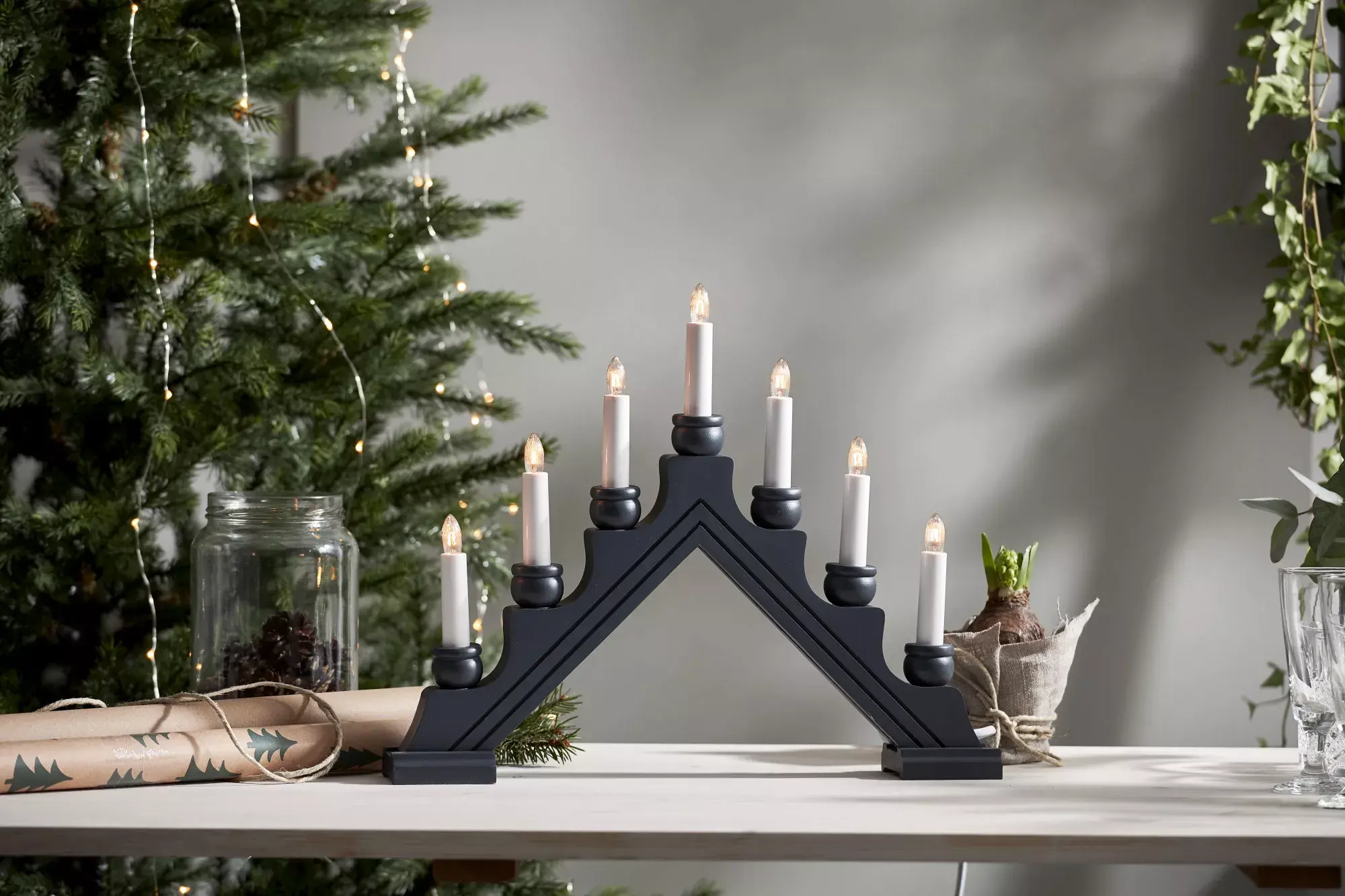 Если ваше счастливое число «7», то рождественская горка «Карина» от Star Trading, на каждой ступеньке которой гордо возвышается белая свеча – то, что вам нужно! Те, кто любят эту замечательную цифру – счастливые люди, ведь известный производитель новогодних украшений предлагает сразу 5 вариантов горки: светло-серую, темно-серую, белую, коричневую или зеленую. Таким образом, вы можете выбрать тот цвет, который гармонирует с предметами интерьера помещения, где вы планируете встречать Новый год. На ступеньках деревянных горок гордо возвышаются белые свечи с подсвечниками в тон – выглядит стильно и торжественно. Изделия работают от сети при помощи выключателя.