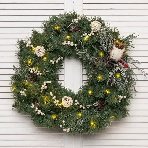 При приближении Нового Года многие начинают задумываться об украшении своего жилища, ведь этот праздник — один из самых любимых и радостных с детства. К тому же традиционно он предполагает использование множества декоративных элементов. Красиво выполненный новогодний интерьер, позволит полностью окунуться в атмосферу праздника. Предлагаем Вашему внимаю Хвойный венок из коллекции «Тайна леса» от Российского производителя ЕлкиТорг. Венок выполнен из высококачественных материалов и украшен модными ротанговыми шариками, декоративной фигуркой совы, ягодами и натуральными шишками. Венок имеет жесткий каркас, легко крепится в удобное место. Изделие будет радовать не один год, сохраняя свою новизну! Гирлянда работает от батареек, благодаря чему венок можно повесить в любом месте, вне зависимости от наличия электросети.
