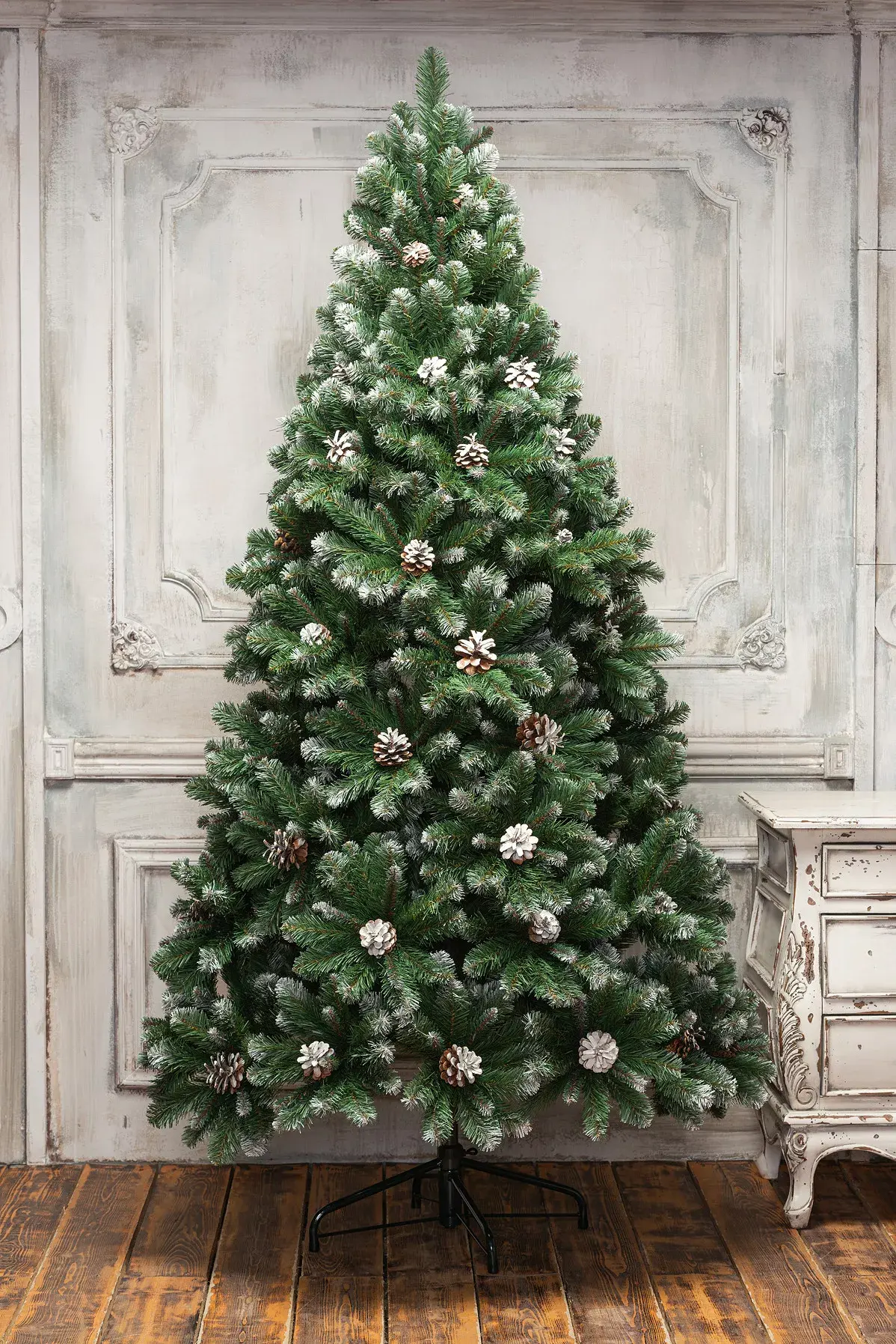Лесная красавица выполнена из высококачественного материала – мягкой пленки PVC, иголочки совсем не колются в отличии от живой елки. Каждая веточка покрыта инеем - это и есть ее неповторимая изюминка. А натуральные шишки, которыми украшена ель, придают ей особый шарм.