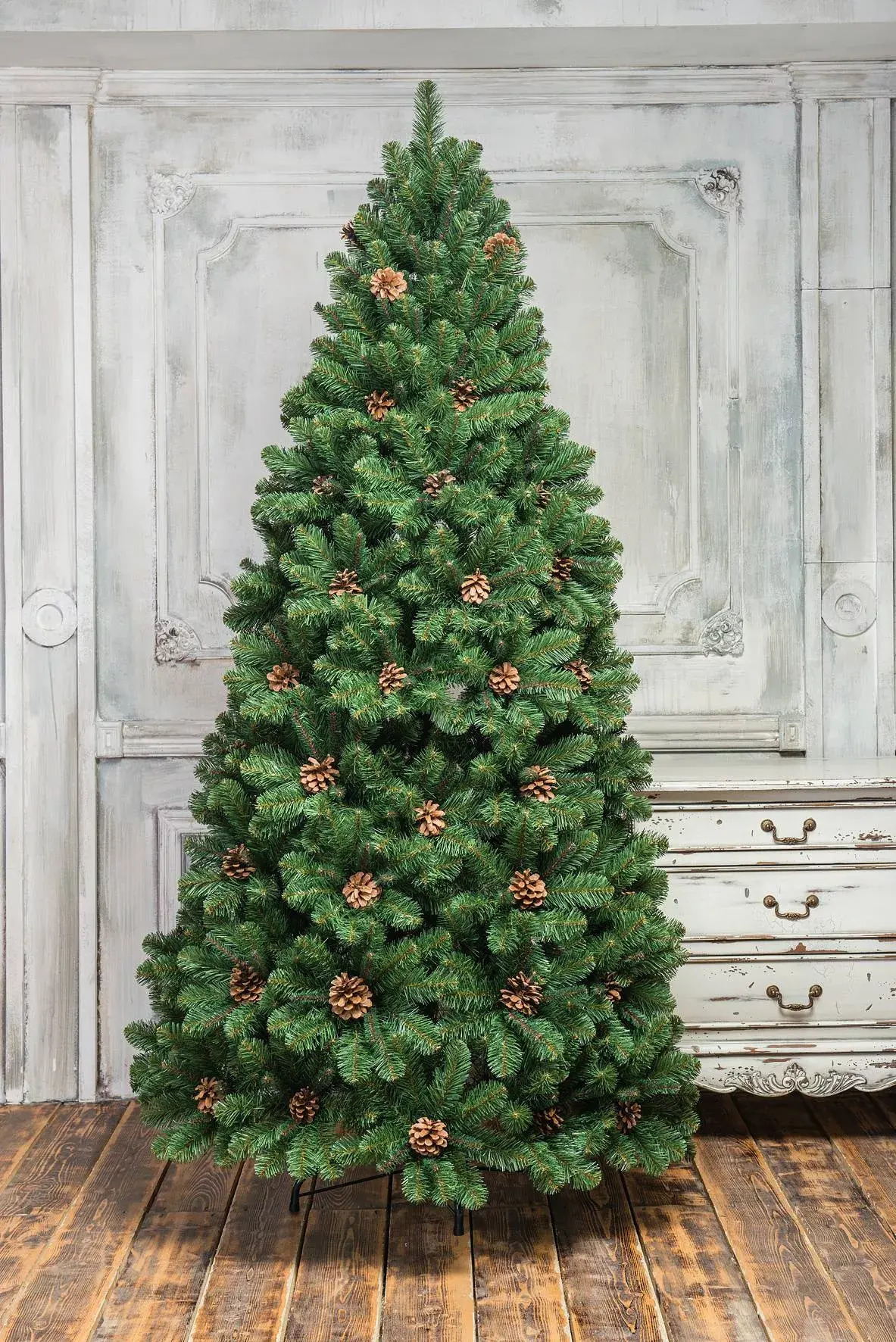 Сосна создана из современного материала пленки PVC. Это специальная пленка для создания новогодних елок, из нее получаются очень похожие на настоящие новогодние красавицы. Особый шарм задают встроенные в ветви натуральные сосновые шишки, привезенные из Сибири.