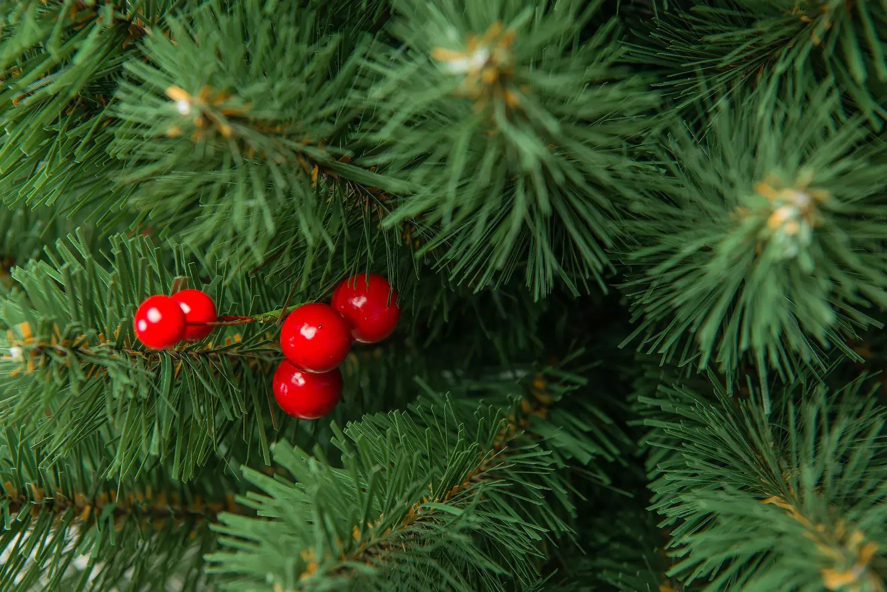 Но главная особенность модели — это искусственные веточки калины, ими украшены ветви нашей елочки. В сочетании с красивой подставкой, елочка уже является готовой новогодней композицией, даже не наряженная шариками и прочими игрушками.
