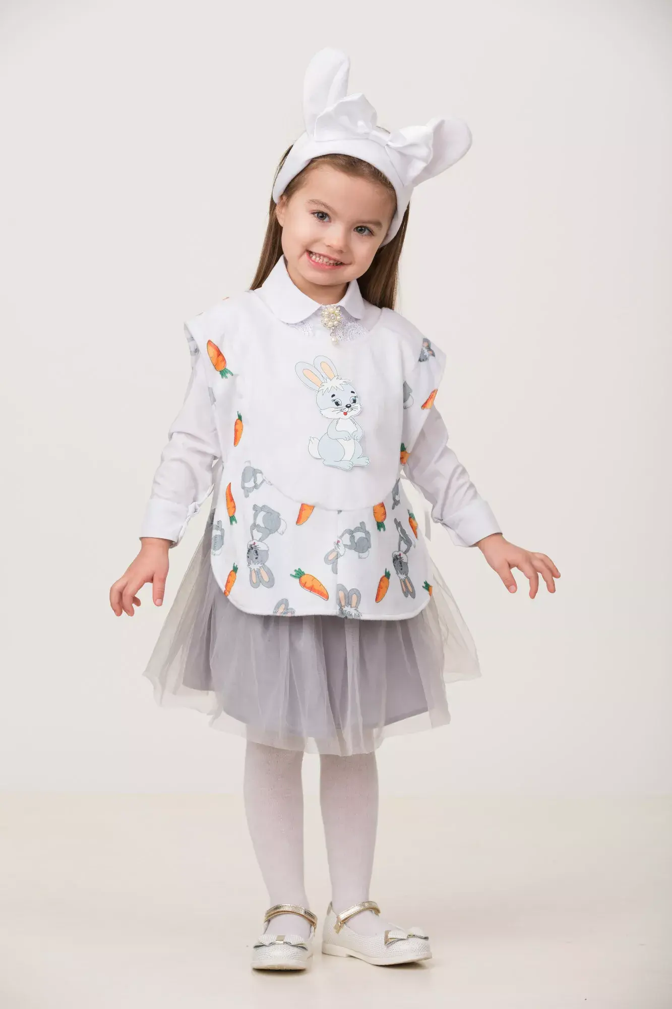 Костюм "Зайка" порадует на празднике абсолютно всех детей и взрослых. Состоит костюм из накидки с изображением зайчат и морковок, такую накидку можно надевать поверх своей одежды и головного убора с ушками и бантом.