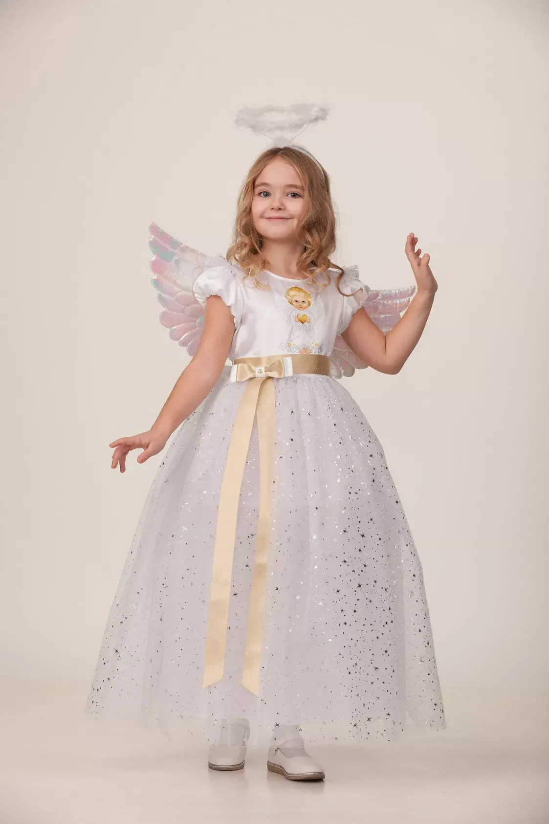 Платье "Ангел" - это тот сказочный и красочный карнавальный костюм, который сделает образ девочки ярким и запоминающимся на любом празднике. Необыкновенно красивое длинное платье усыпано звездочками, и волшебные крылья и нимб позволят исполнить любое желание.