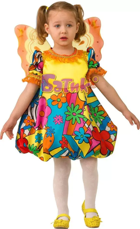Яркая красавица-бабочка станет желанным образом для многих девочек. Оригинальный красочный костюм подойдет для различных мероприятий, таких как новогодняя елка, детский спектакль, бал-маскарад, тематический праздник. Костюм Бабочка состоит из пышного разноцветного платья и крылышек.