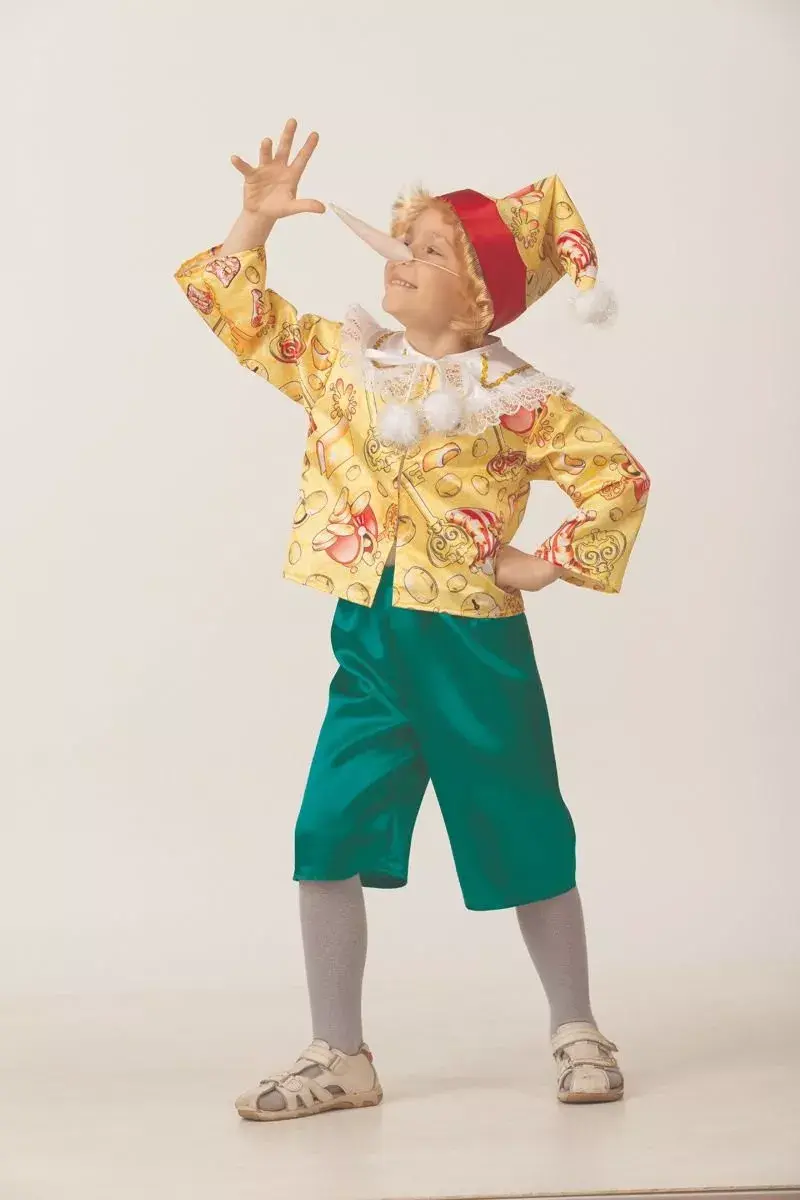 Озорной и задорный Буратино знаком нам с детства. Данный костюм позволит вашему ребенку идеально войти в образ любимого героя. Костюм можно приобрести на новогодний утренник либо для театрального представления. В комплект входит: куртка, шорты, колпак с волосами, накладной нос.