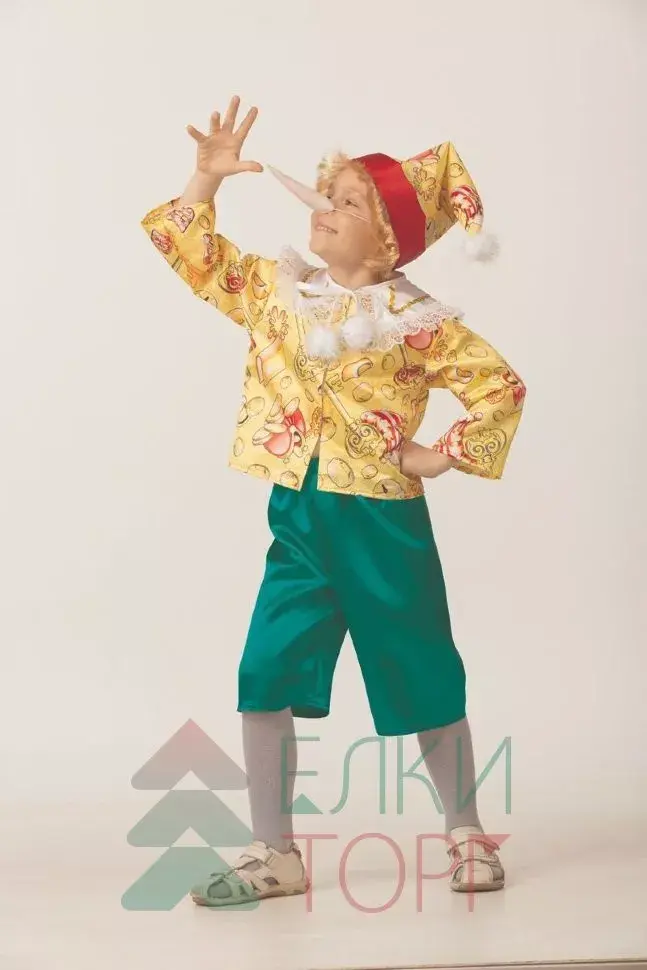 Озорной и задорный Буратино знаком нам с детства. Данный костюм позволит вашему ребенку идеально войти в образ любимого героя. Костюм можно приобрести на новогодний утренник либо для театрального представления. В комплект входит: куртка, шорты, колпак с волосами, накладной нос.