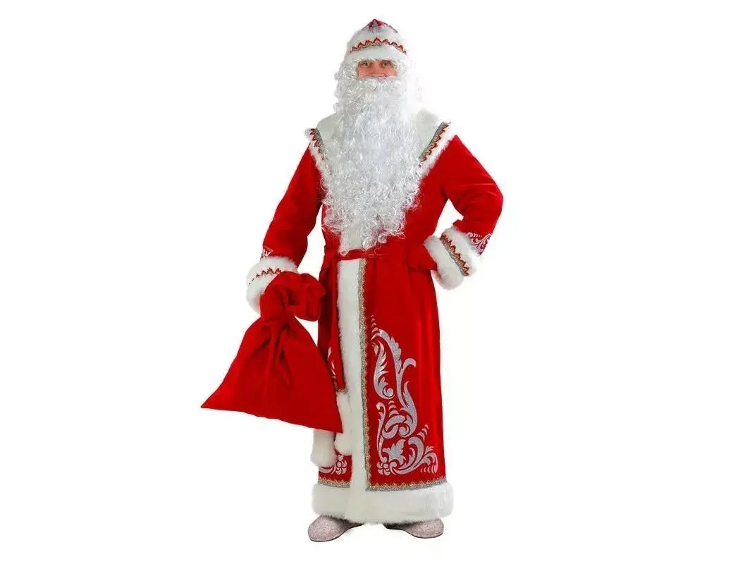 Классический карнавальный костюм Дед Мороз для взрослых изготовлен из бархатной ткани высокого качества, отделанный искусственным мехом. В комплект костюма входит: Бархатная шуба с белой меховой отделкой, золотой тесьмой и серебряной аппликацией; шапка с белой меховой отделкой и тесьмой красного и золотого цвета; пояс; бархатные варежки; белоснежная борода и парик; мешок для подарков.