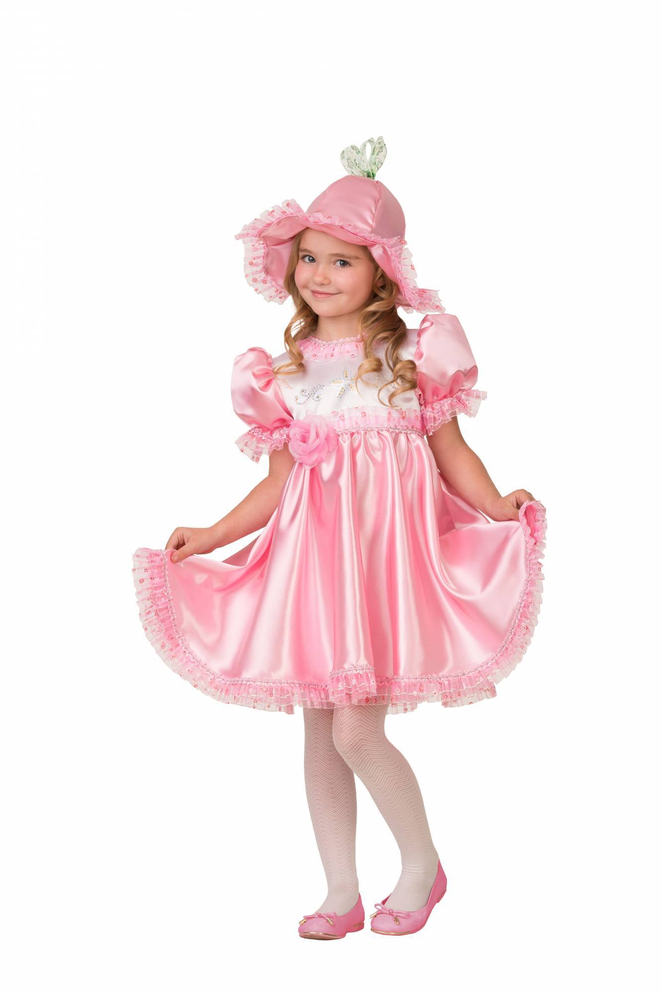 Карнавальный костюм Дюймовочка сделан из нежно-розовой ткани и великолепно передает образ персонажа из сказки. Костюм состоит из платьица и шапочки в форме колокольчика. Такой костюм превратит девочку в прелестную малышку из сказки.