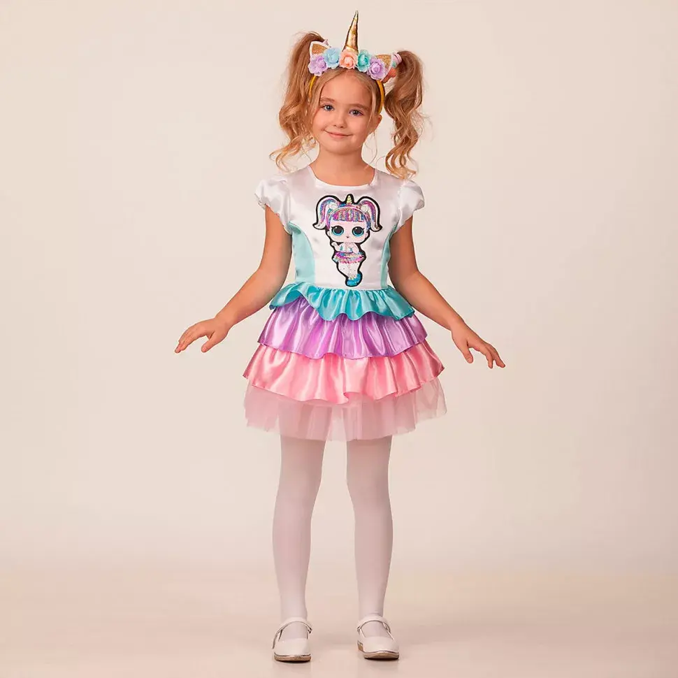 Маскарадный костюм Единорожки для девочек - милый и волшебный наряд для тематических фотосессий, праздников и маскарадных мероприятий. Любая девочка захочет нарядиться в стиле куклы LOL. Карнавальный костюм Единорожка состоит из платья с короткими рукавами-фонариками и ободка с ушками - цветочками, и золотым рогом.