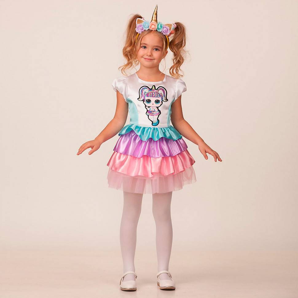 Маскарадный костюм Единорожки для девочек - милый и волшебный наряд для тематических фотосессий, праздников и маскарадных мероприятий. Любая девочка захочет нарядиться в стиле куклы LOL. Карнавальный костюм Единорожка состоит из платья с короткими рукавами-фонариками и ободка с ушками - цветочками, и золотым рогом.