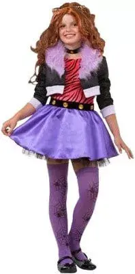Карнавальный костюм Клодин Вульф один из самых оригинальных и эффектных: комбидресс с принтом черного и кораллового цвета, черный жакет с воротником из искусственного меха фиолетового цвета, пышная фиолетовая юбочка с окантовкой из черной сетки, украшение-бархотка на шее, фиолетовые чулочки с принтом "паутина с паучками". Парик Клодин Вульф - это шикарная прическа из длинных локонов и обручем для волос, украшенном декоративными ушками.Костюм "Клодин Вульф"-незаменимый комплект для любого праздника.