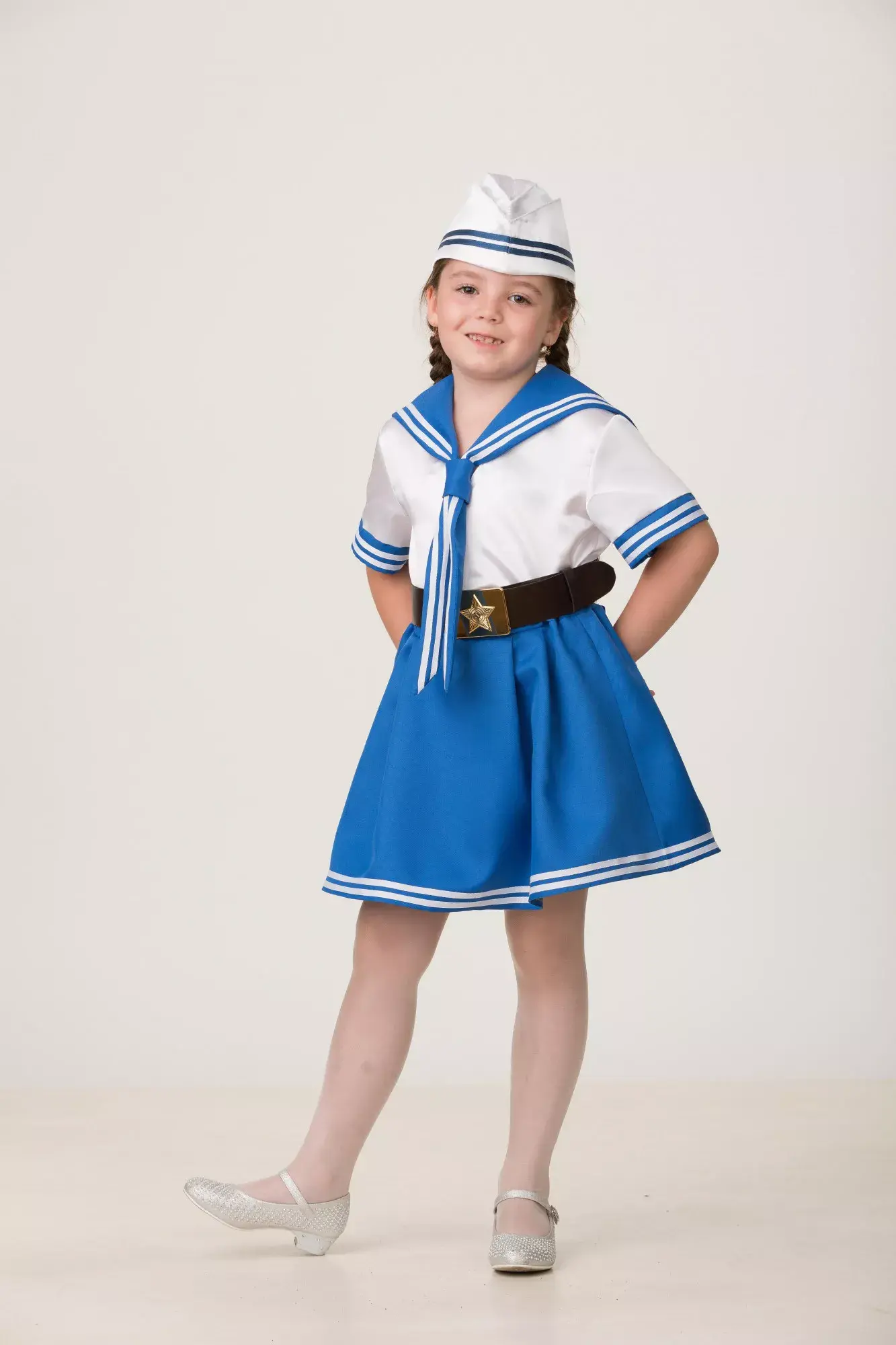 Костюм "Морячка" подойдёт для праздников, посвящённых морской и военной тематике: Дню Победы, 23 февраля и других. В комплект входит белая блузка с синими полосками, юбка синего цвета, пилотка и солдатский ремень. Девочка в таком наряде будет выглядеть опрятно и красиво.