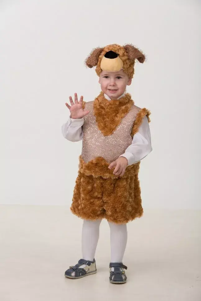 Замечательный карнавальный костюм для мальчика в образе маленькой собачки – такой наряд станет главным украшением любого детского утренника или тематического спектакля. В комплект костюма входит безрукавная жилетка с отделкой из собачьей шёрстки и удобные короткие шортики. Роль завершающего элемента костюма играет прекрасная и очень реалистичная собачья маска, с мордочкой и ушками. Наряд выполнен в бежево-коричневых тонах, благодаря чему образ выглядит очень реалистично и узнаваемо.