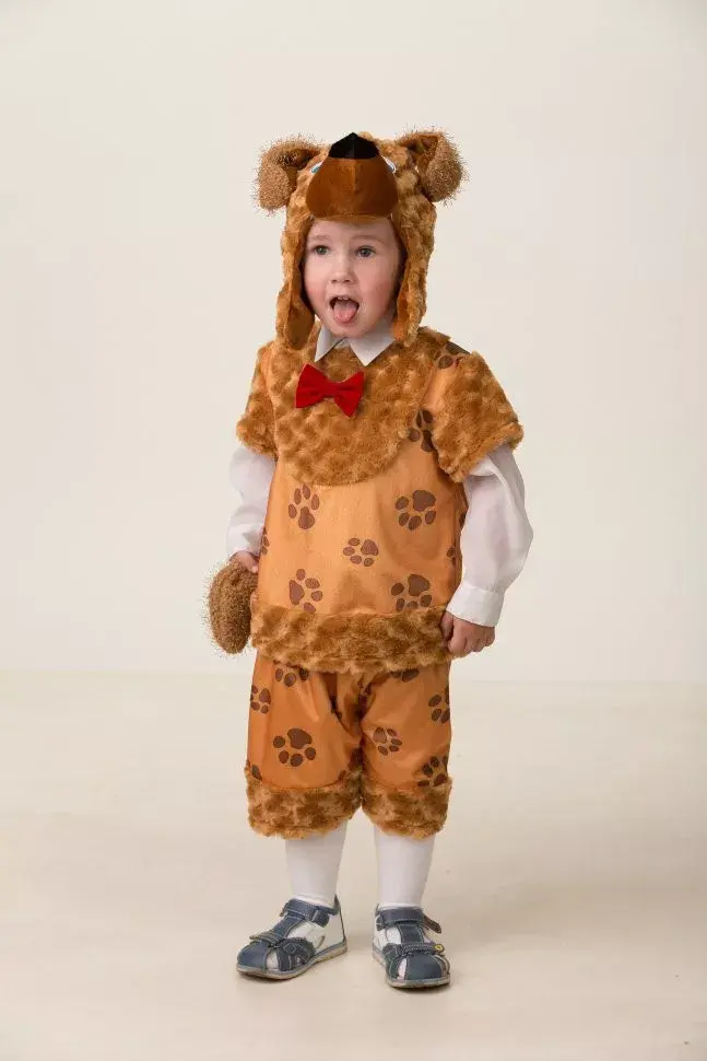Замечательный костюм на Новый год "Собачка Бобик" несомненно, понравится любому мальчишке, да и некоторые девочки заходят превратиться в такого милого песика. Одежда не сковывает движений и отлично смотрится на дошкольниках и учащихся начальных классов. Нарядный комплект состоит из шорт и жилетки, также есть шапка-маска, которая легко надевается и не слетает во время игр вокруг новогодней елки. Маскарадный костюм пошит из плюша с принтом, изображения собачьих лапок превосходно дополняют этот образ. Для больше правдоподобности используется искусственный коричневый мех, из которого сделана отделка по краю одежды и хвост.