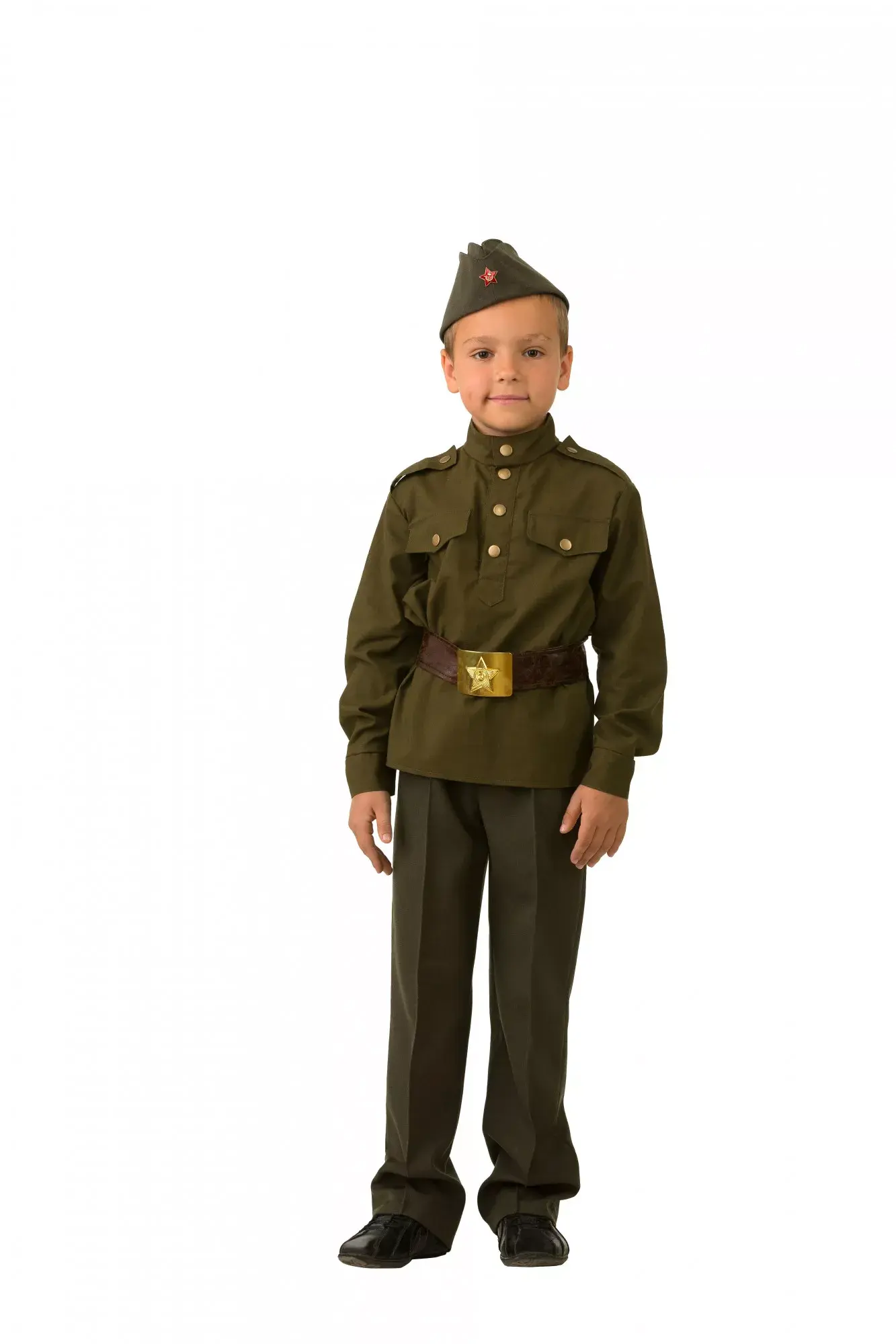 Этот детский костюм стилизован под военную форму солдата и подойдёт для различных мероприятий военной тематики: празднования Дня Победы, а также Дня защитника Отечества. В комплект костюма "Солдат" входят: гимнастерка с золотистыми пуговицами, строгие брюки, коричневый ремень с золотистой бляхой и пилотка с небольшой звездочкой. Ваш маленький солдат покорит сердца всех вокруг.