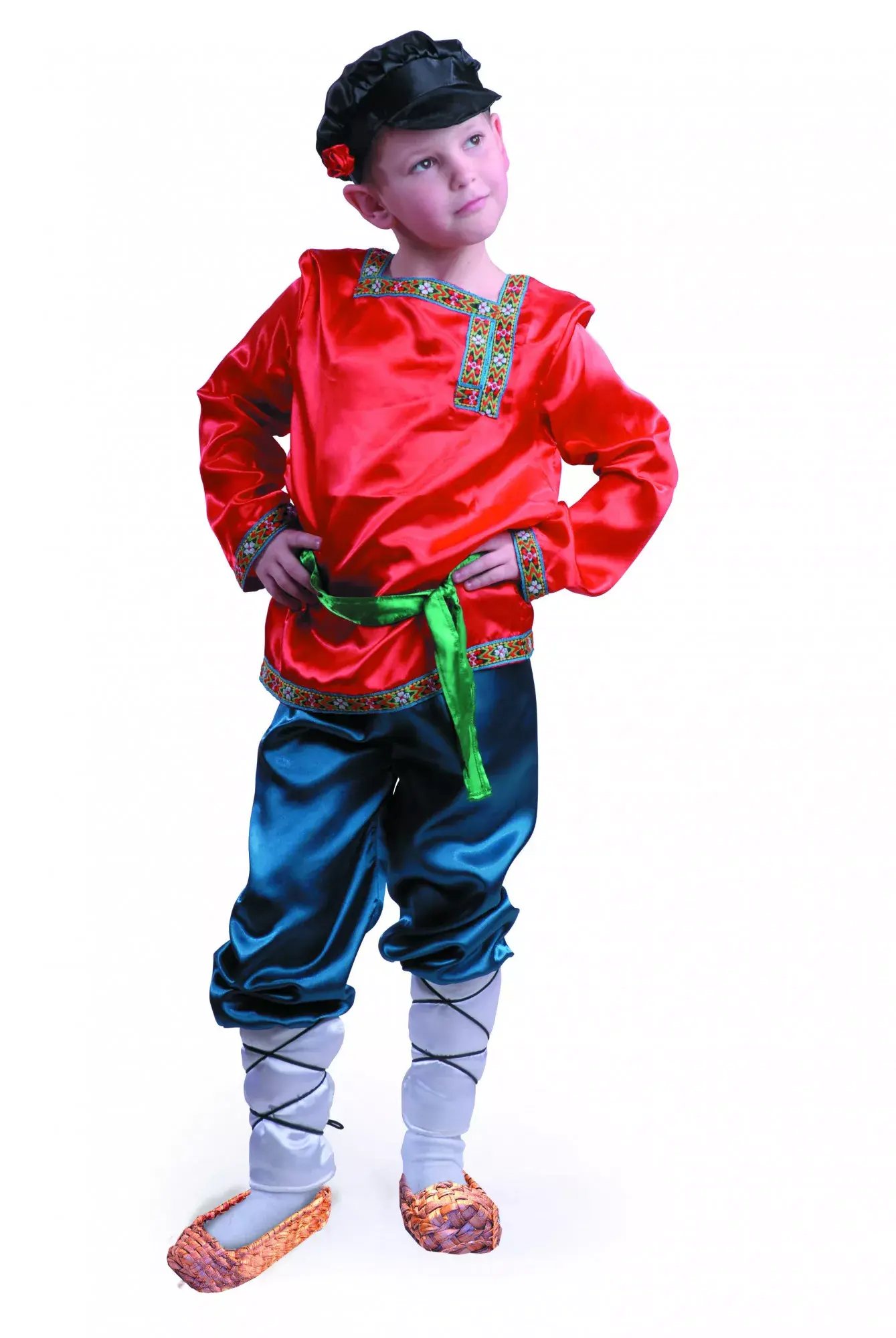 Костюм "Ванюша" - это яркий и веселый образ для любого праздника, будь то театральное представление или новогодний утренник. В комплект входит кепка с красным цветком, красная рубашка с орнаментом и синие брюки, они сшиты из атласной ткани, что придаёт наряду праздничный вид.