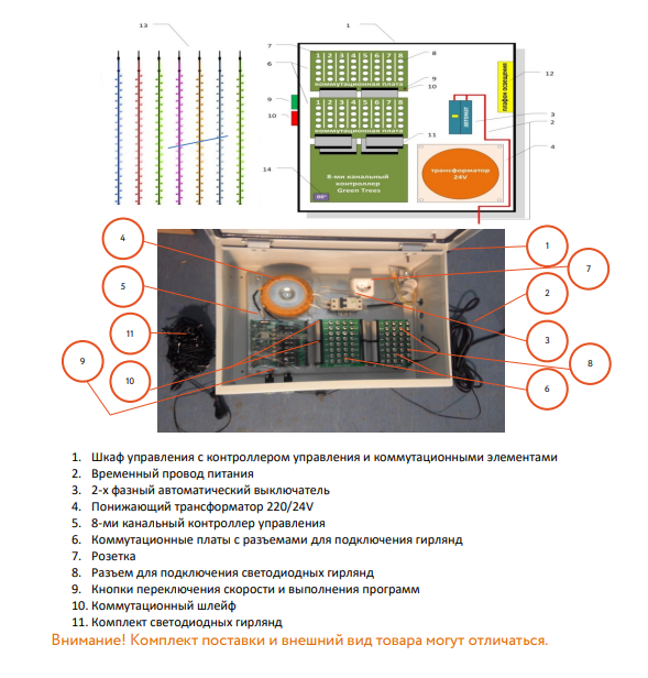 Набор освещения «Классик» включает в себя: гирлянды из светодиодов на 24 V длиной 12 м или 18 м (светодиоды через 10 см), располагающиеся на елке вертикальными лучами (для елок более 12 м - возможно, другое расположение), трансформаторы, контроллеры, автомат, УЗО и монтажный ящик с защитой IP54. При вертикальном расположении, шаг гирлянд у основания 35-50 см.