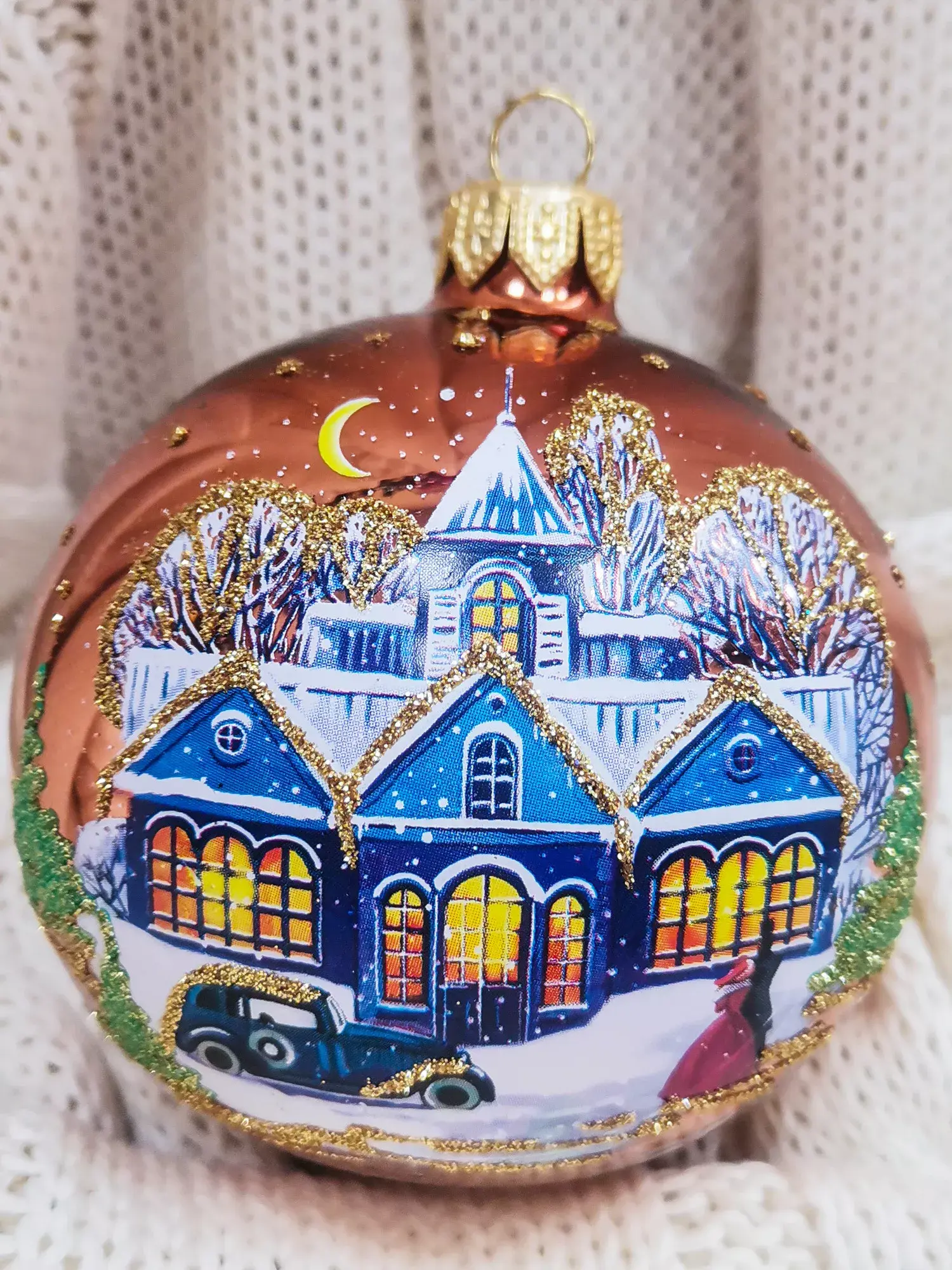 Если вы неравнодушны к роскоши, то непременно оцените по достоинству елочный шар «Рождественская ночь». Великолепный ночной 3D-пейзаж поразит вас и ваших гостей в самое сердце! Заснеженные дома и деревья, сугробы белоснежного снега на фоне золотого неба просто нереально хороши! Изделие смотрится очень богато и сделает честь даже королевскому дворцу.
