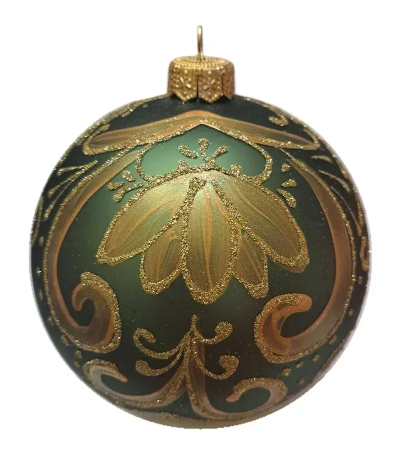 Крупные золотые узоры на темно-зеленом фоне – тренд грядущего года среди елочных украшений. Поэтому стеклянный шар «Графика» – одна из актуальных и продаваемых моделей нашего каталога. Шар выглядит богато, поэтому он придаст респектабельности даже самой скромной новогодней елке.
