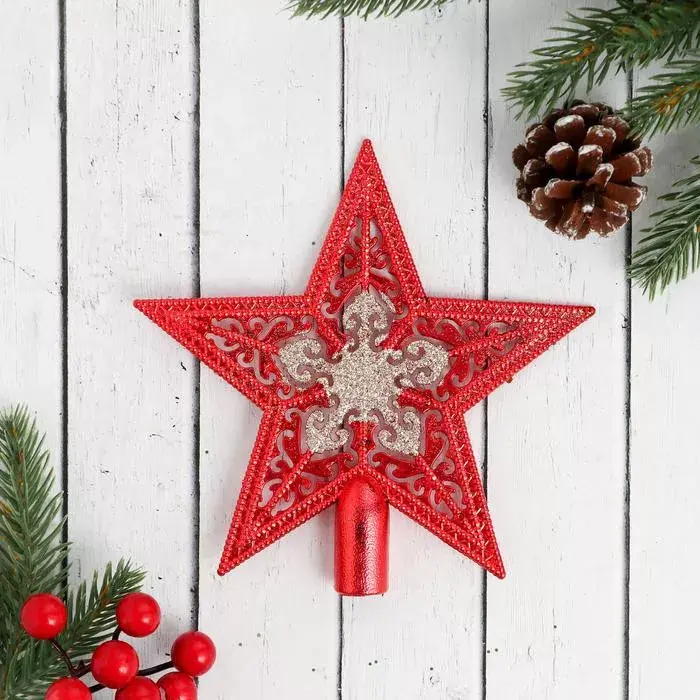 Вы видели снежинки красного цвета? Любители поэкспериментировать с цветом непременно обратят внимание на макушку-звезду «Снежинка». Сочетание красного и серебристого цветов понравится любителям смелых решений. И если вы один из них, то модель «Снежинка» для вас!