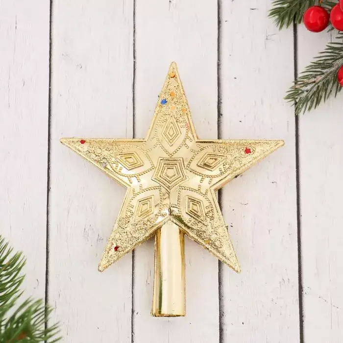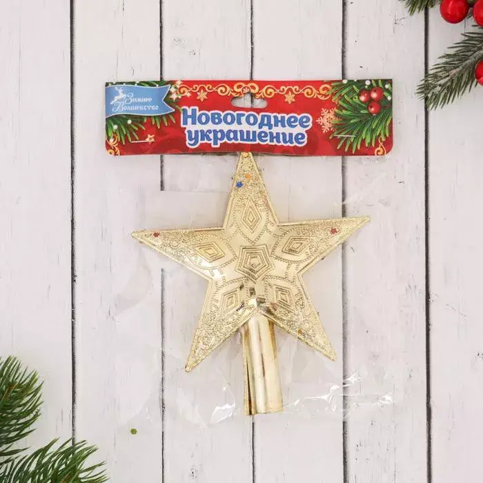 Макушка-звезда золотистого цвета – один из свежих трендов среди елочных украшений. Золотая звезда, украшенная эффектными узорами и старым добрым конфетти, адресована любителям стиля «ретро». Но мы уверены: модель обретет поклонников и среди остальных покупателей!